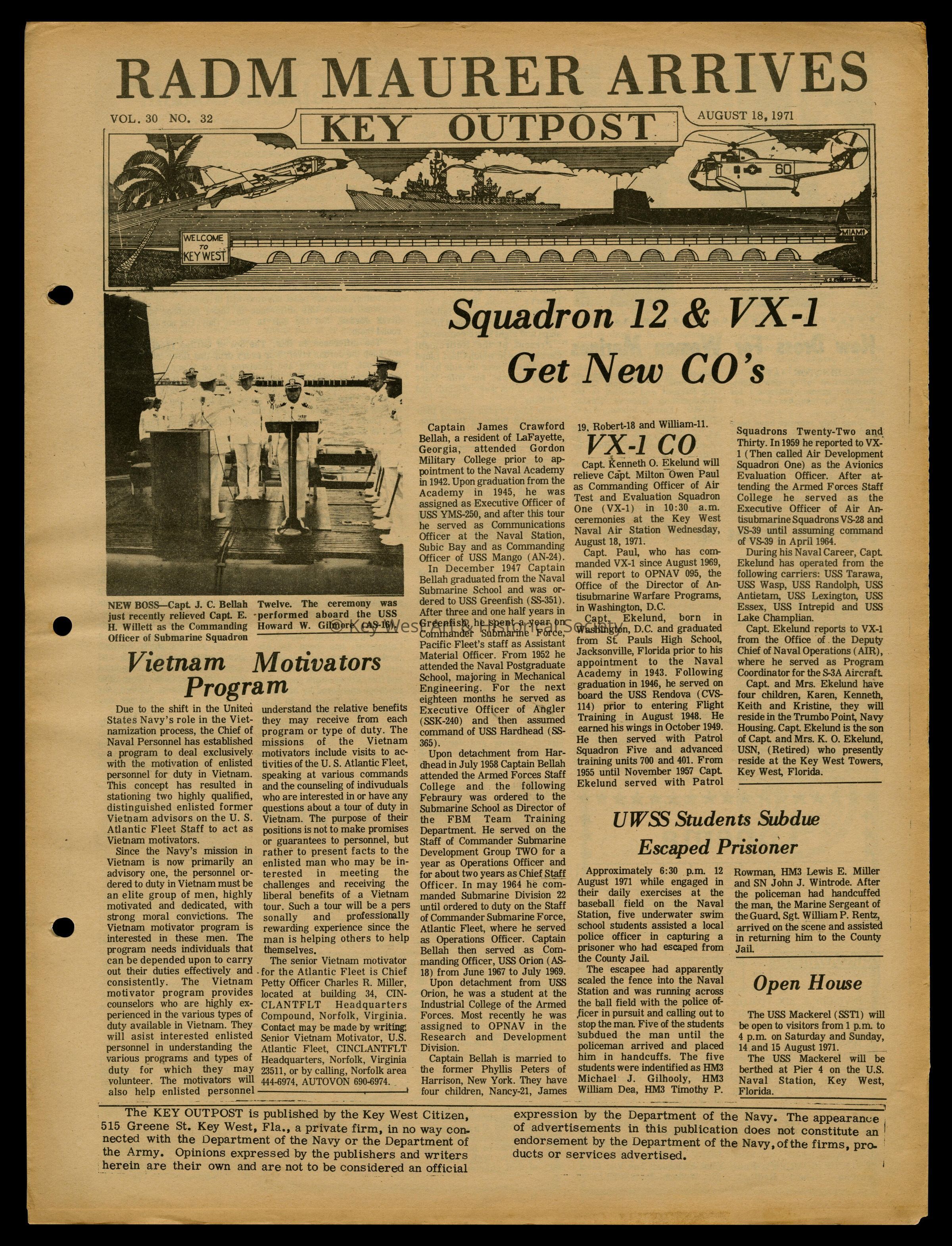 The August 18. 1971 edition of the 'Key Outpost' Newspaper printed by Naval Station Key West as an internal newsletter for military and civilians on base. Volume 30, Number 32. Eight pages.