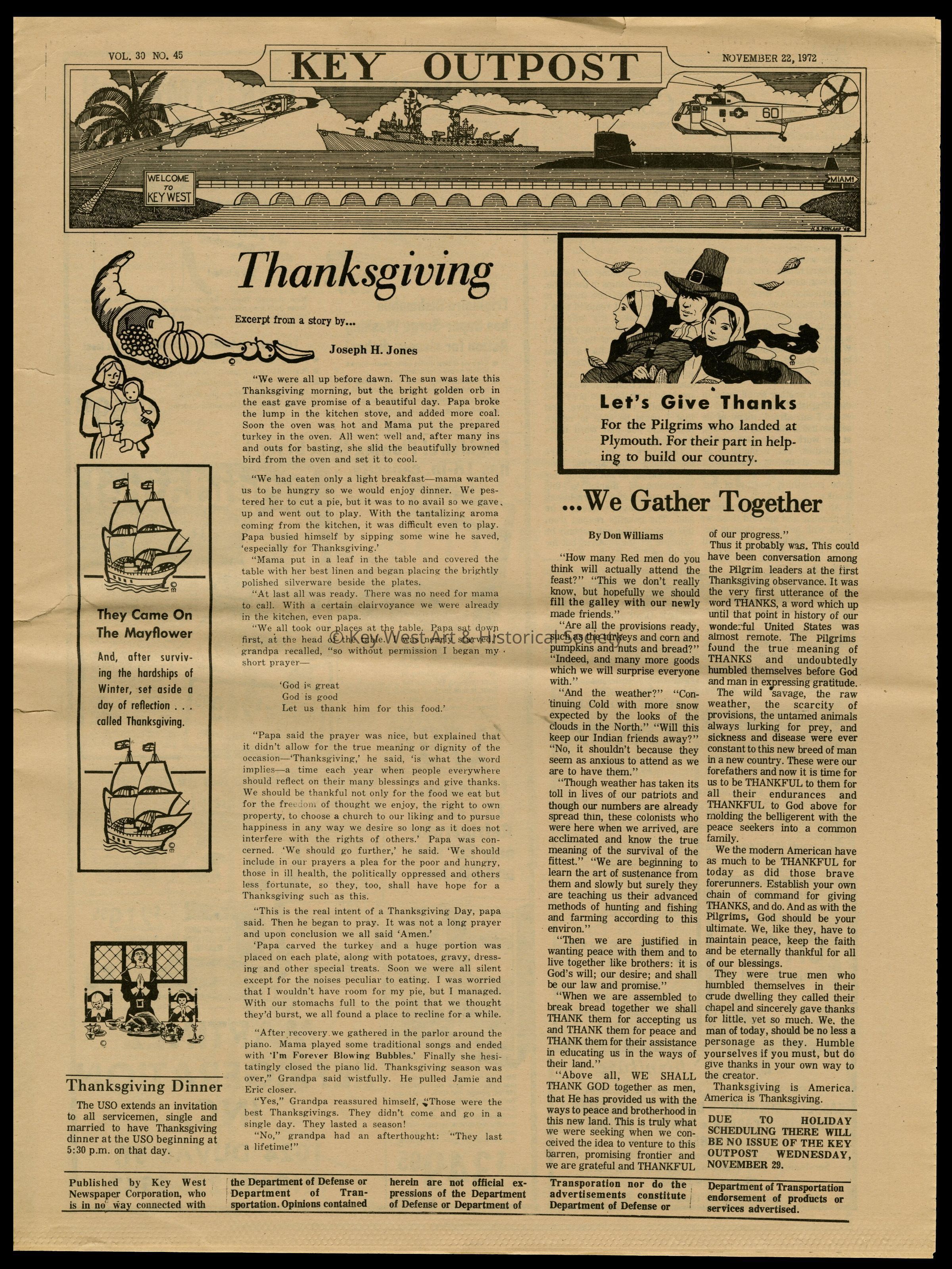 The November 22, 1972 edition of the 'Key Outpost' Newspaper printed by Naval Station Key West as an internal newsletter for military and civilians on base. Volume 30, Number 45. Eight pages.Collection