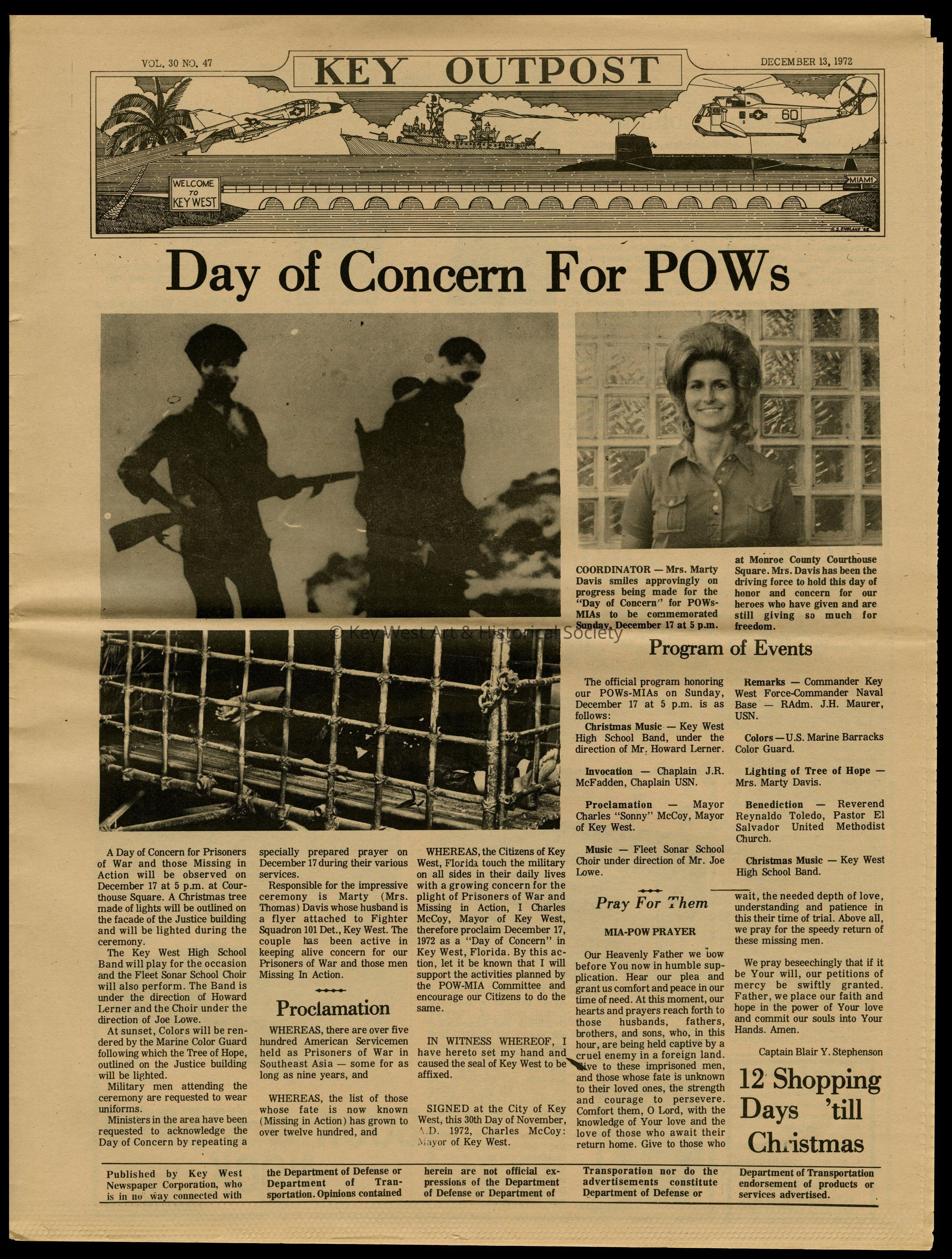 The December 13, 1972 edition of the 'Key Outpost' Newspaper printed by Naval Station Key West as an internal newsletter for military and civilians on base. Volume 30, Number 47. Eight pages.Collection