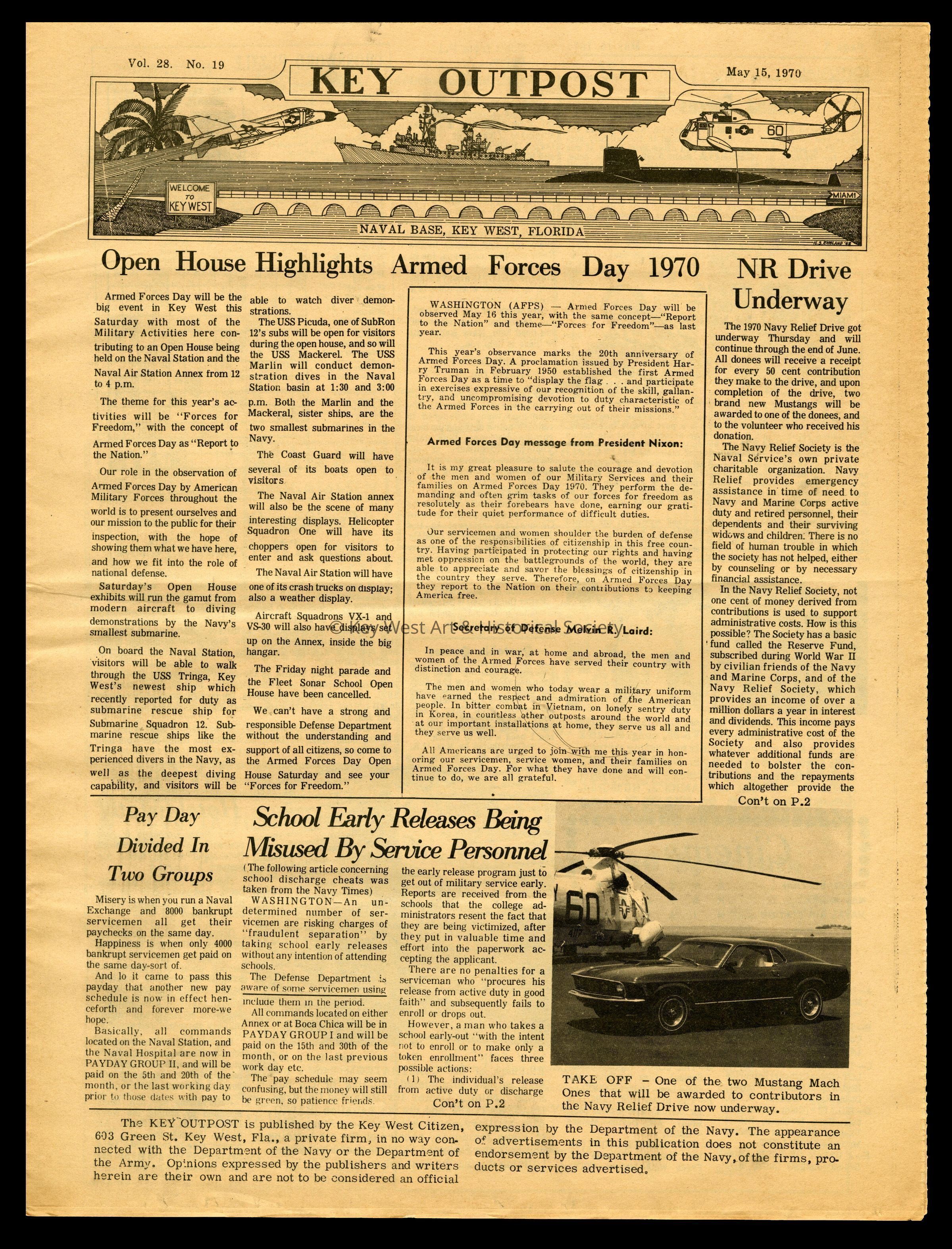 The May 15, 1970 edition of the 'Key Outpost' Newspaper printed by Naval Station Key West as an internal newsletter for military and civilians on base. Volume 28, Number 19. Twelve pages.Collection