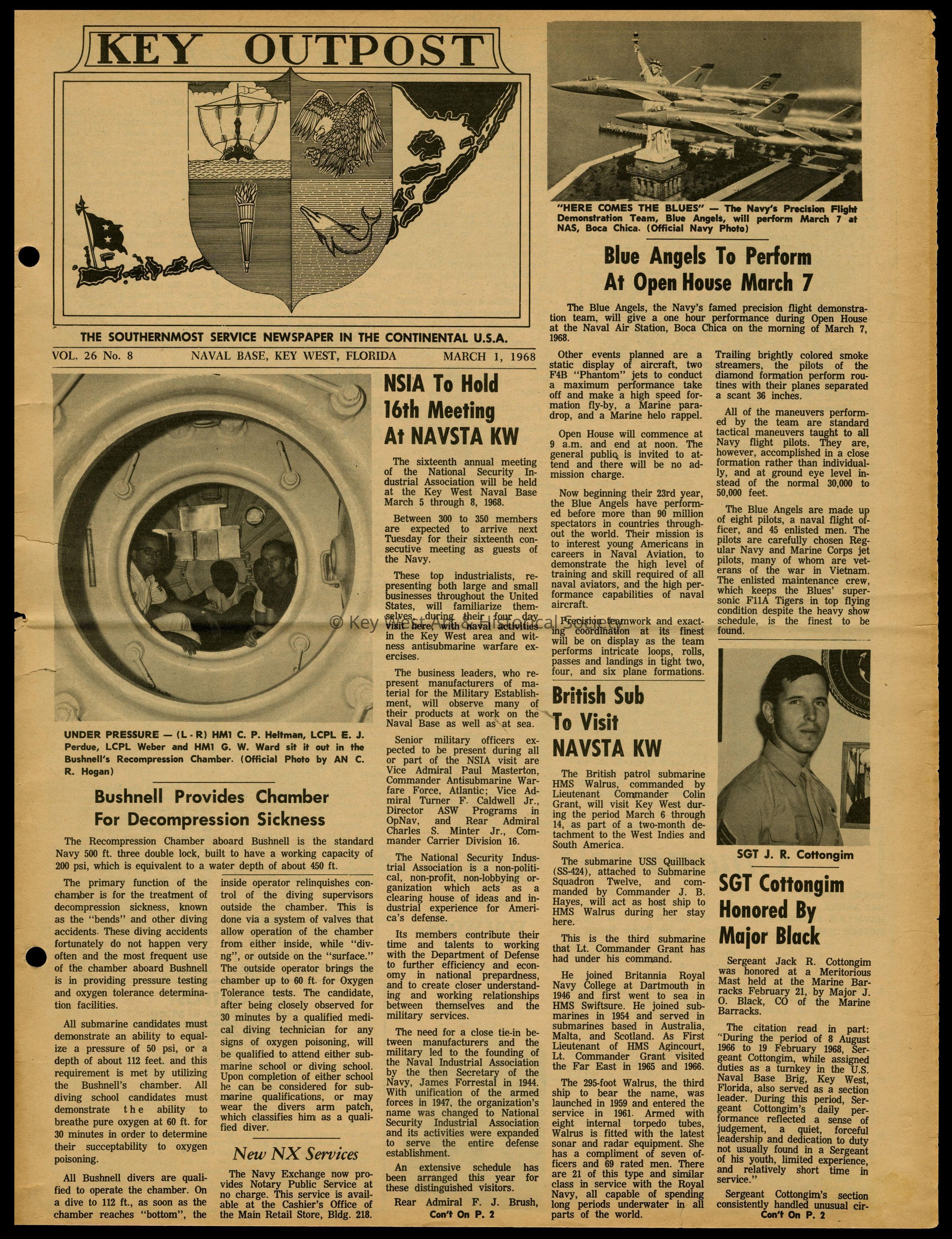 The March 1, 1968 edition of the 'Key Outpost' Newspaper printed by Naval Station Key West as an internal newsletter for military and civilians on base. Volume 26, Number 8. Four pages.Collection