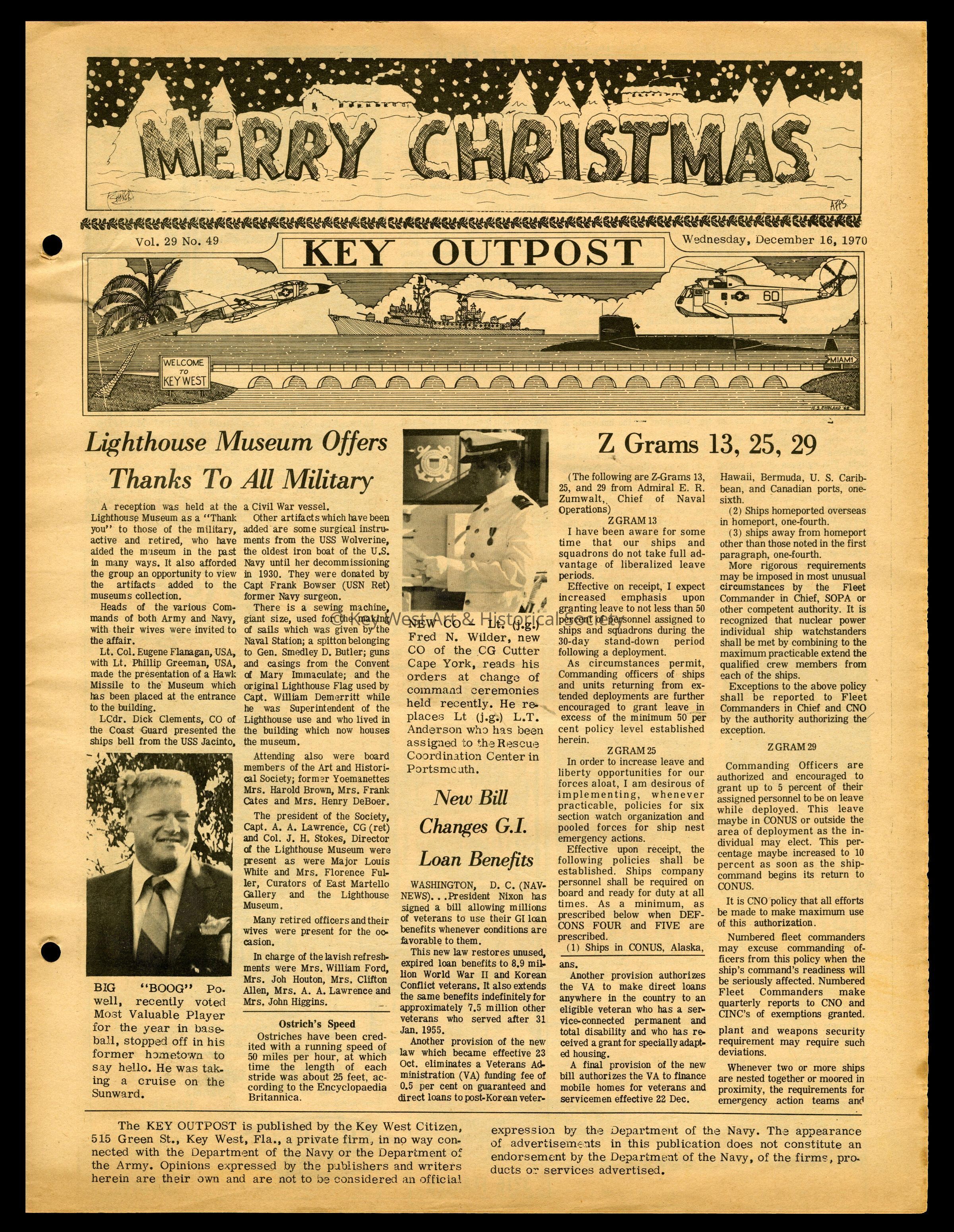 The December 16, 1970 edition of the 'Key Outpost' Newspaper printed by Naval Station Key West as an internal newsletter for military and civilians on base. Volume 28, Number 49. Eight pages.Collection