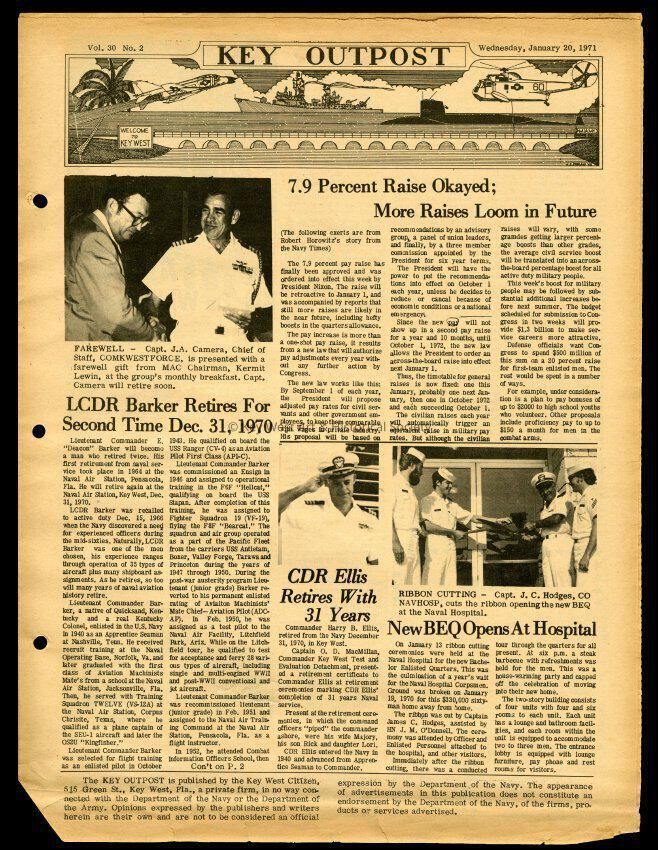 The January 20, 1971 edition of the 'Key Outpost' Newspaper printed by Naval Station Key West as an internal newsletter for military and civilians on base. Volume 30, Number 2. Eight pages.Collection