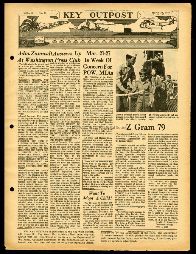 The March 24, 1971 edition of the 'Key Outpost' Newspaper printed by Naval Station Key West as an internal newsletter for military and civilians on base. Volume 30, Number 11. Eight pages.Collection