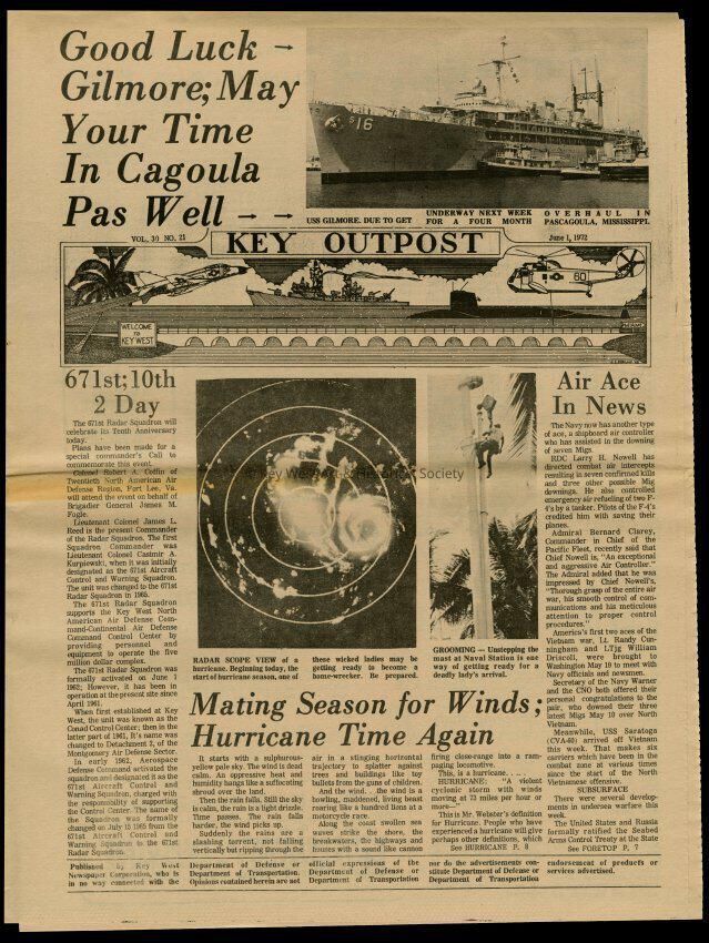 The June 1, 1972 edition of the 'Key Outpost' Newspaper printed by Naval Station Key West as an internal newsletter for military and civilians on base. Volume 31, Number 21. Eight pages.Collection