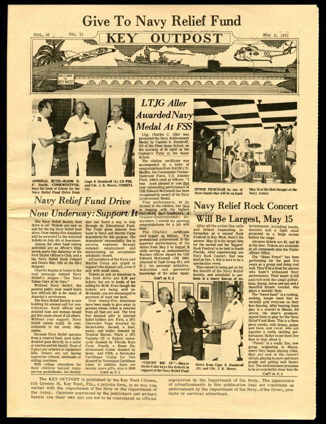 The May 5, 1971 edition of the 'Key Outpost' Newspaper printed by Naval Station Key West as an internal newsletter for military and civilians on base. Volume 30, Number 17. Twelve pages.Collection