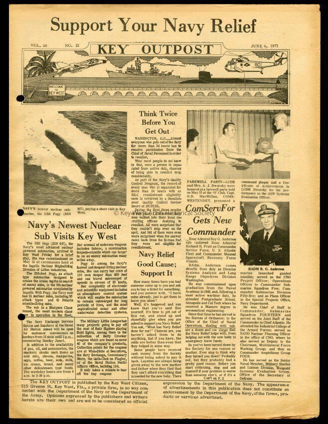 The June 4, 1971 edition of the 'Key Outpost' Newspaper printed by Naval Station Key West as an internal newsletter for military and civilians on base. Volume 30, Number 21. Eight pages.Collection