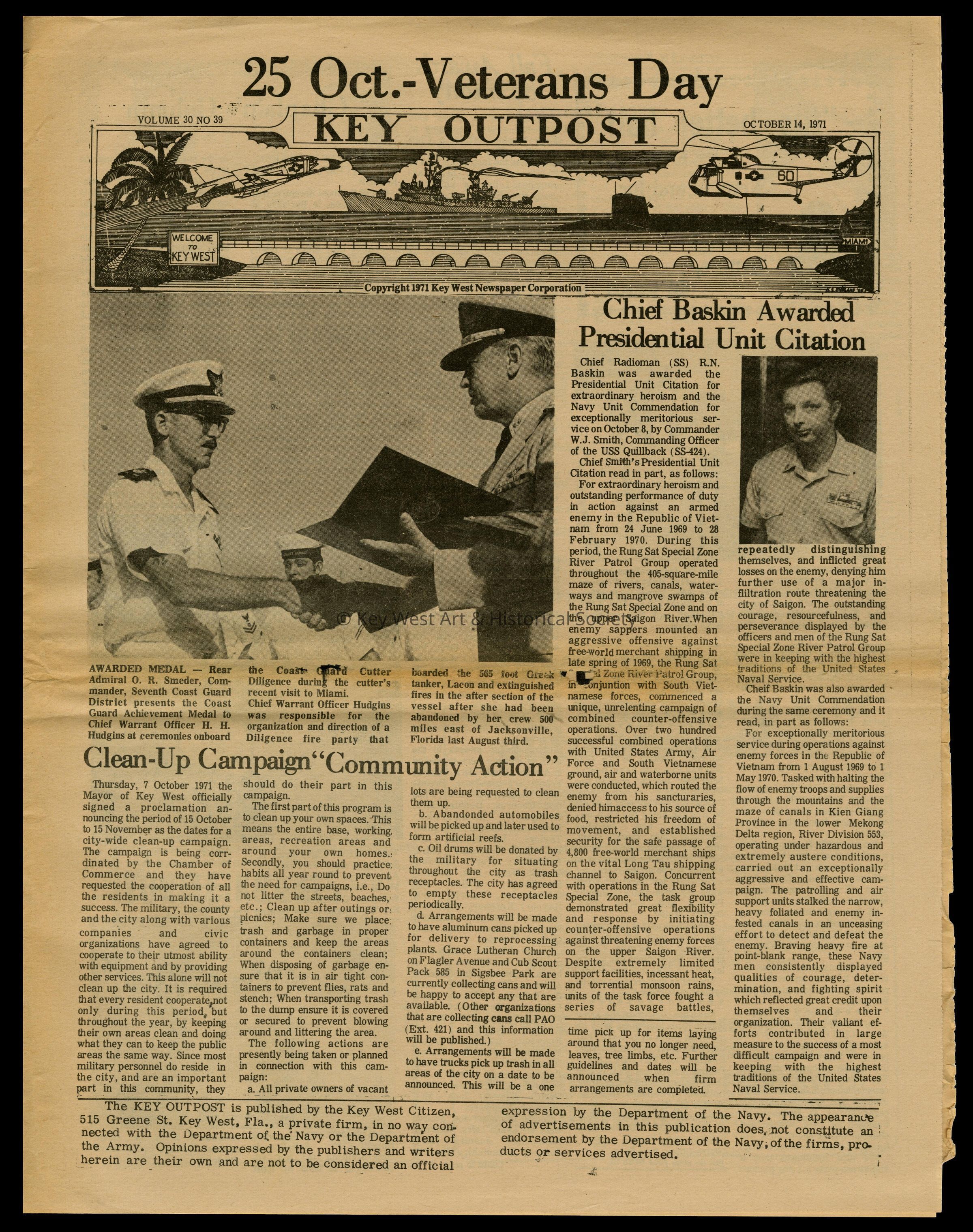 The October 14, 1971 edition of the 'Key Outpost' Newspaper printed by Naval Station Key West as an internal newsletter for military and civilians on base. Volume 30, Number 39. Eight pages.Collection