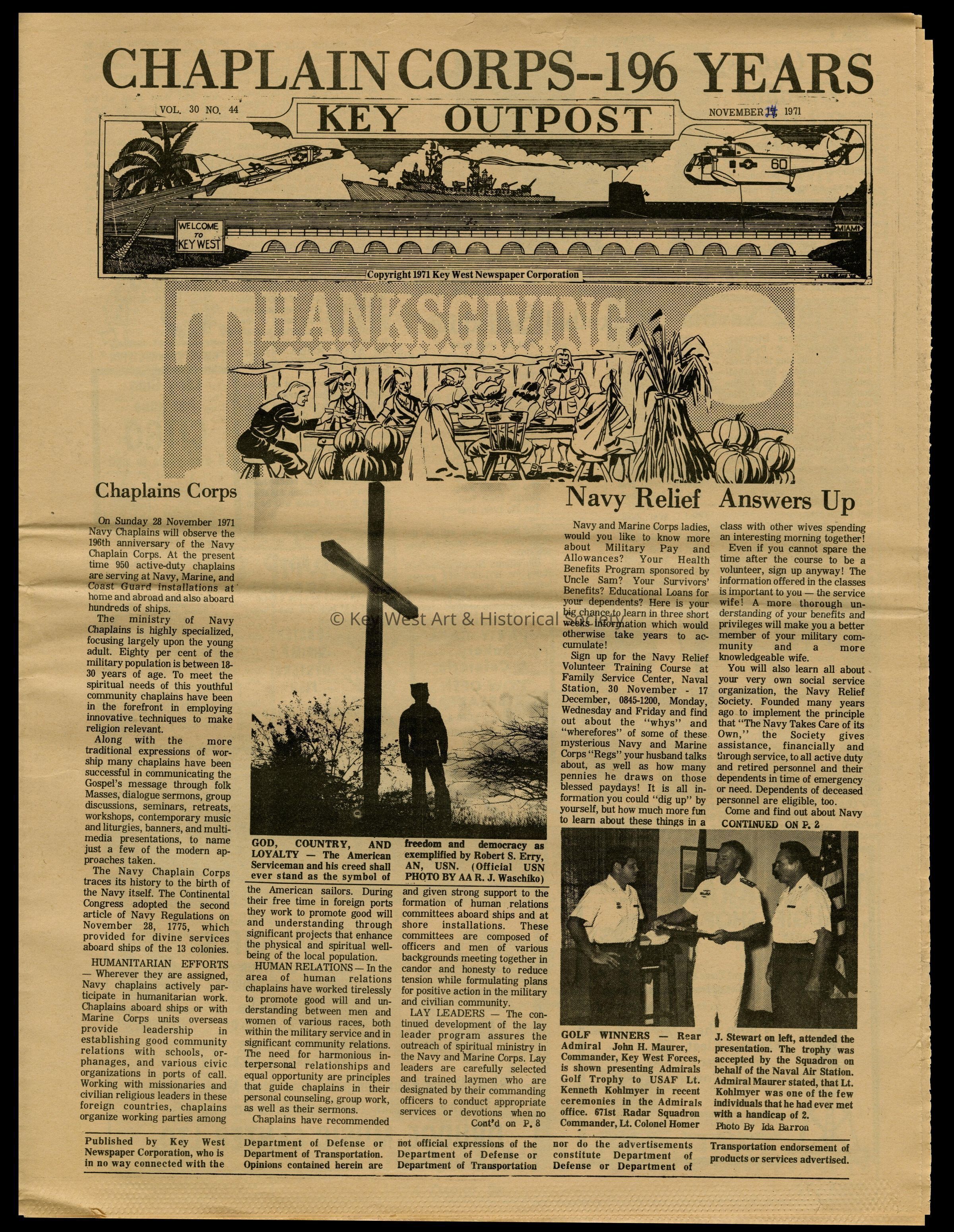 The November 14, 1971 edition of the 'Key Outpost' Newspaper printed by Naval Station Key West as an internal newsletter for military and civilians on base. Volume 30, Number 44. Eight pages.Collection