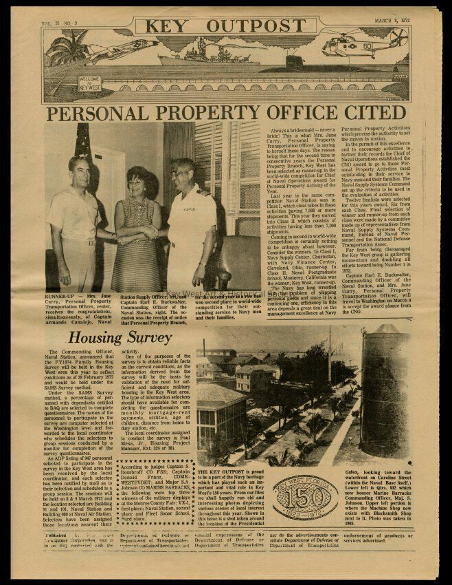 The March 8, 1972 edition of the 'Key Outpost' Newspaper printed by Naval Station Key West as an internal newsletter for military and civilians on base. Volume 31, Number 9. Eight pages.Collection