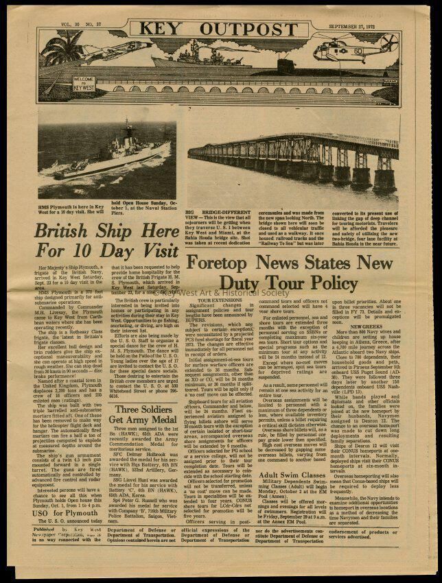 The September 27, 1972 edition of the 'Key Outpost' Newspaper printed by Naval Station Key West as an internal newsletter for military and civilians on base. Volume 30, Number 37. Eight pages.Collection