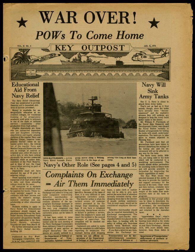 The January 31, 1973 edition of the 'Key Outpost' Newspaper printed by Naval Station Key West as an internal newsletter for military and civilians on base. Volume 31, Number 4. Eight pages.