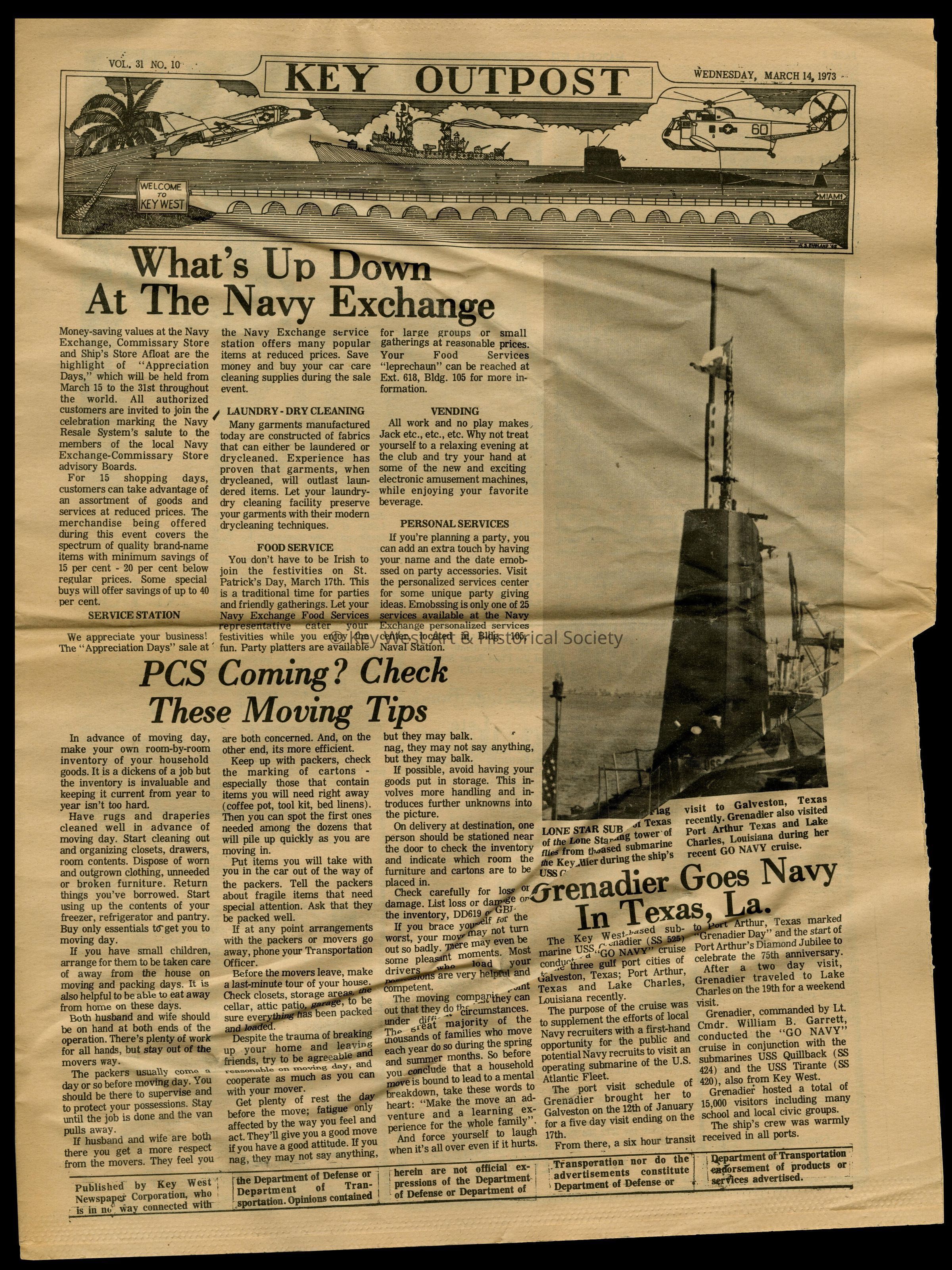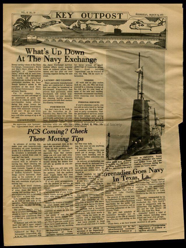The March 14, 1973 edition of the 'Key Outpost' Newspaper printed by Naval Station Key West as an internal newsletter for military and civilians on base. Volume 31, Number 10. Eight pages.Collection