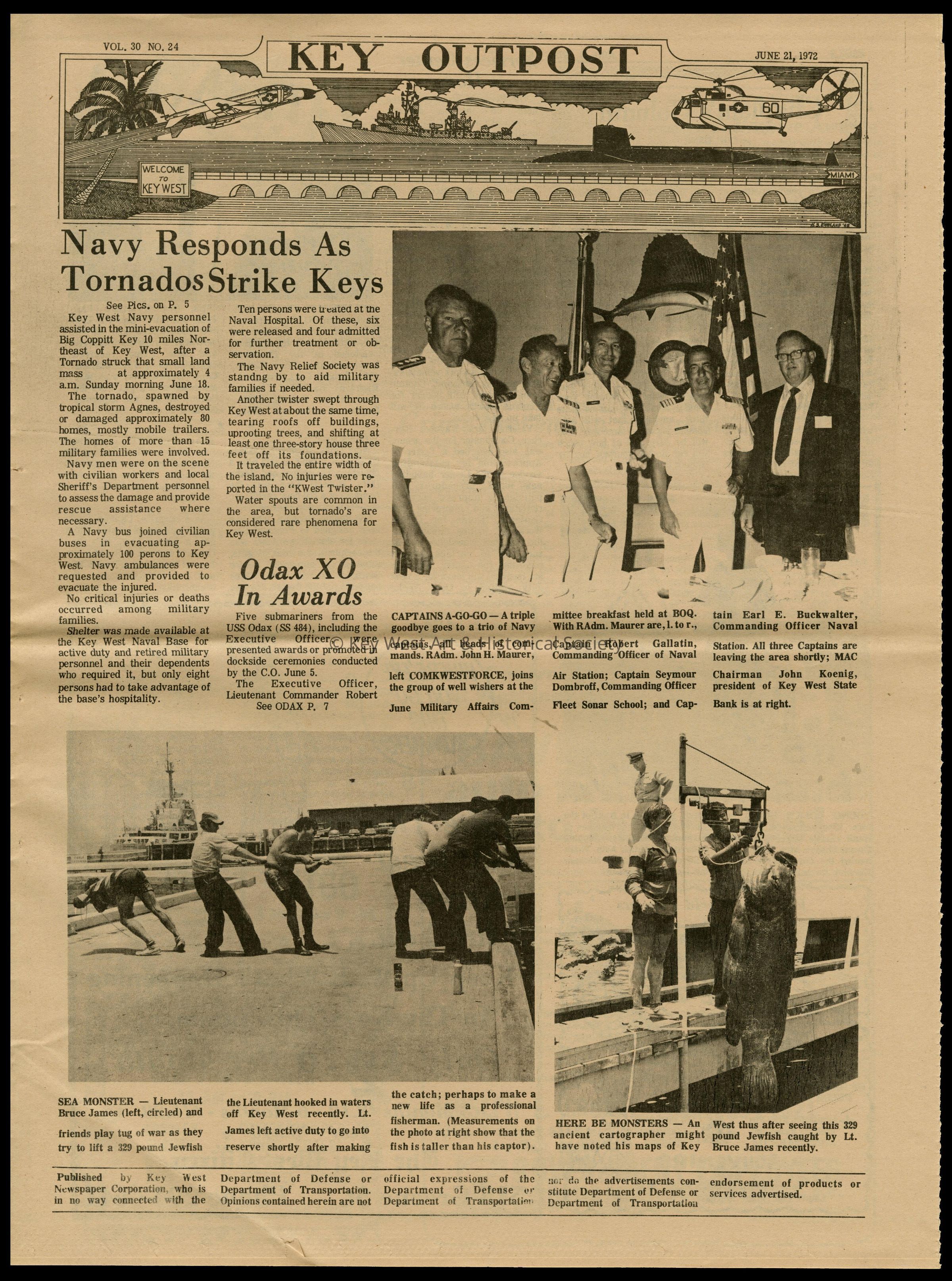The June 21, 1972 edition of the 'Key Outpost' Newspaper printed by Naval Station Key West as an internal newsletter for military and civilians on base. Volume 31, Number 24. Eight pages.Collection