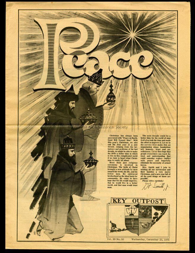 The December 23, 1970 edition of the 'Key Outpost' Newspaper printed by Naval Station Key West as an internal newsletter for military and civilians on base. Volume 28, Number 50. Eight pages.Collection