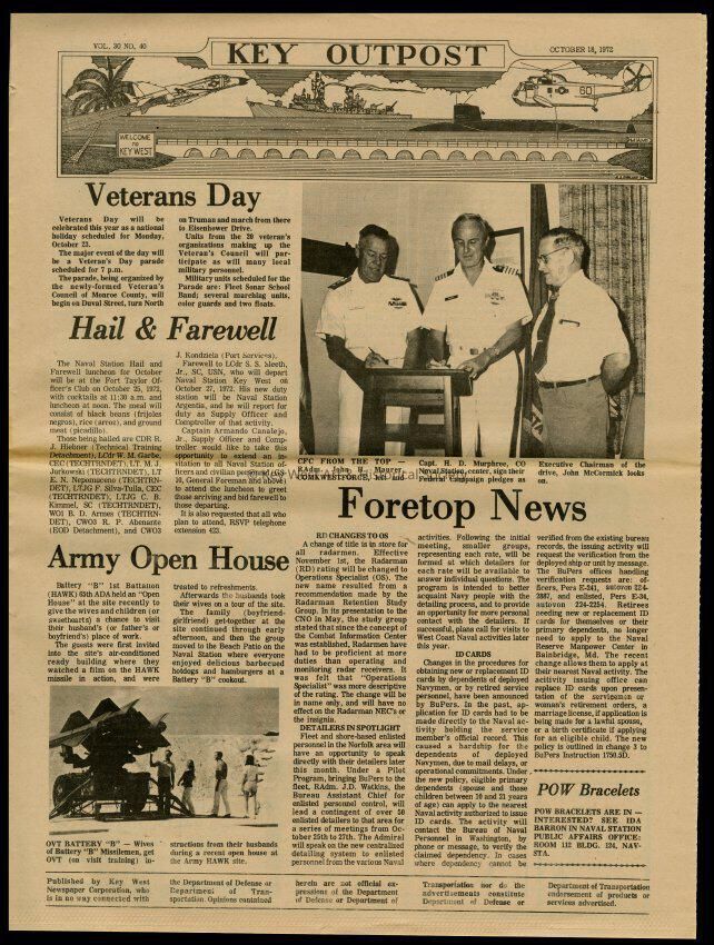 The October 18, 1972 edition of the 'Key Outpost' Newspaper printed by Naval Station Key West as an internal newsletter for military and civilians on base. Volume 30, Number 40. Eight pages.Collection