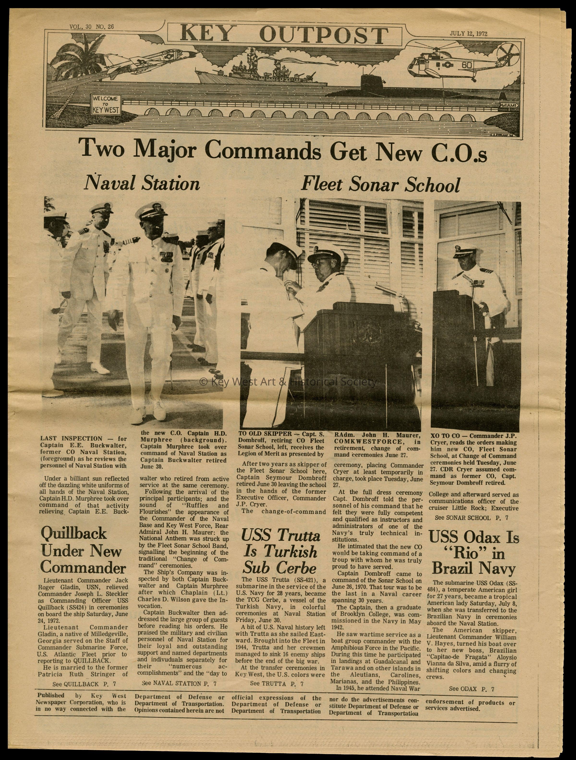 The July 12, 1972 edition of the 'Key Outpost' Newspaper printed by Naval Station Key West as an internal newsletter for military and civilians on base. Volume 31, Number 26. Eight pages.Collection