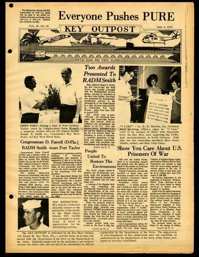 The September 4, 1970 edition of the 'Key Outpost' Newspaper printed by Naval Station Key West as an internal newsletter for military and civilians on base. Volume 28, Number 35. Eight pages.