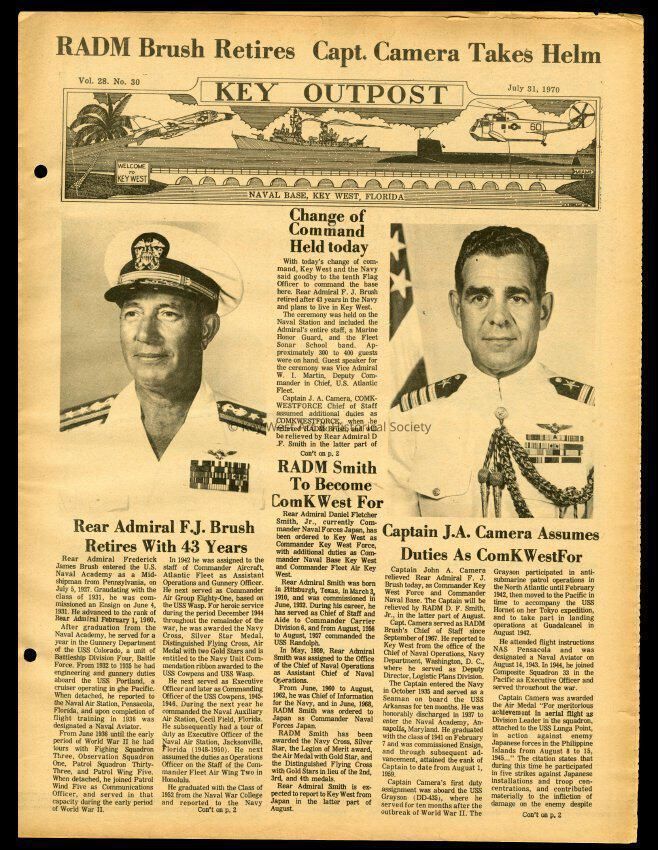 The July 31, 1970 edition of the 'Key Outpost' Newspaper printed by Naval Station Key West as an internal newsletter for military and civilians on base. Volume 28, Number 30. Eight pages.