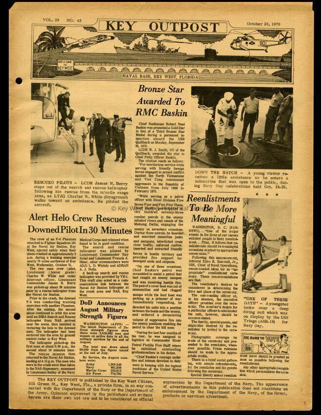 The October 28, 1970 edition of the 'Key Outpost' Newspaper printed by Naval Station Key West as an internal newsletter for military and civilians on base. Volume 28, Number 42. Eight pages.Collection