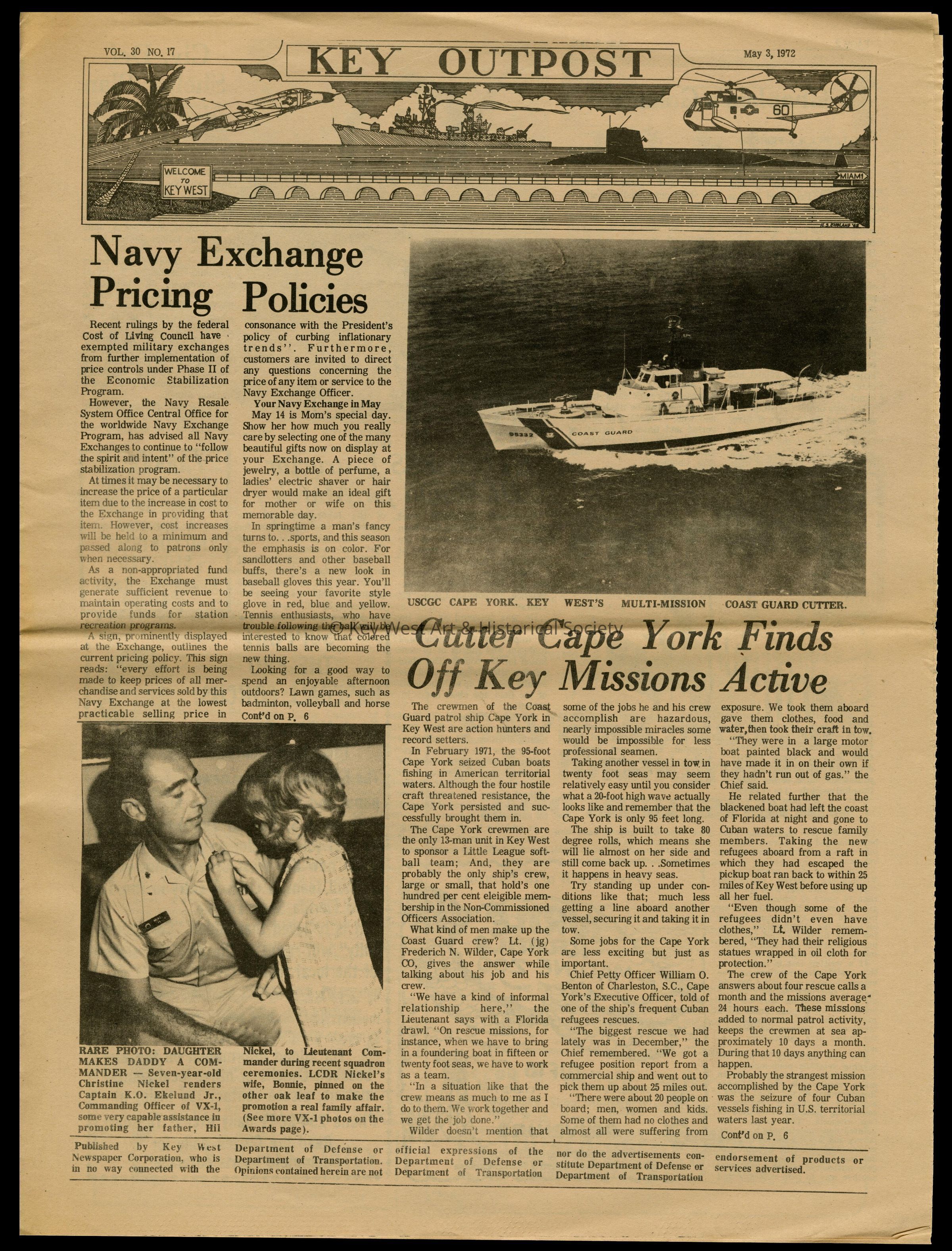 The May 3, 1972 edition of the 'Key Outpost' Newspaper printed by Naval Station Key West as an internal newsletter for military and civilians on base. Volume 31, Number 17. Eight pages.Collection