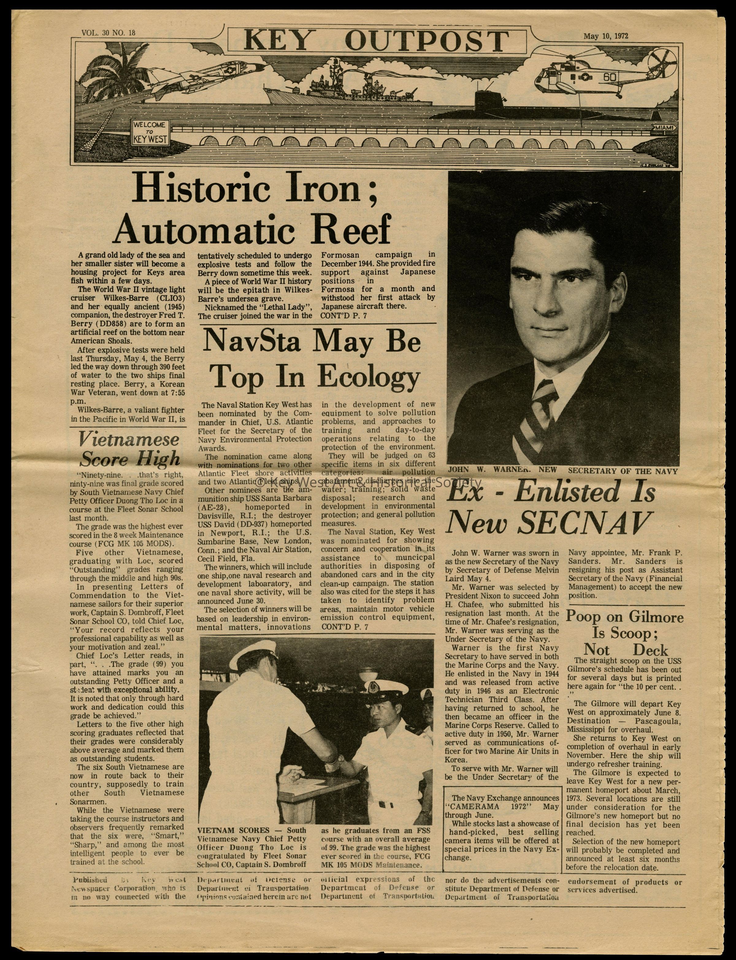 The May 10, 1972 edition of the 'Key Outpost' Newspaper printed by Naval Station Key West as an internal newsletter for military and civilians on base. Volume 31, Number 18. Eight pages.Collection