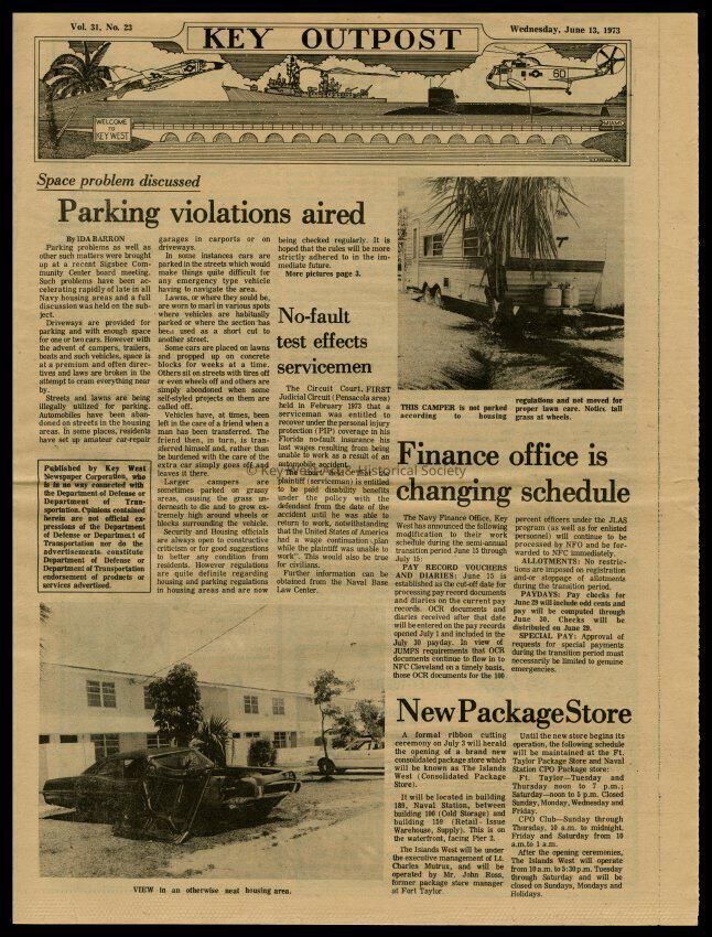The June 13, 1973 edition of the 'Key Outpost' Newspaper printed by Naval Station Key West as an internal newsletter for military and civilians on base. Volume 31, Number 23. Four pages.Collection
