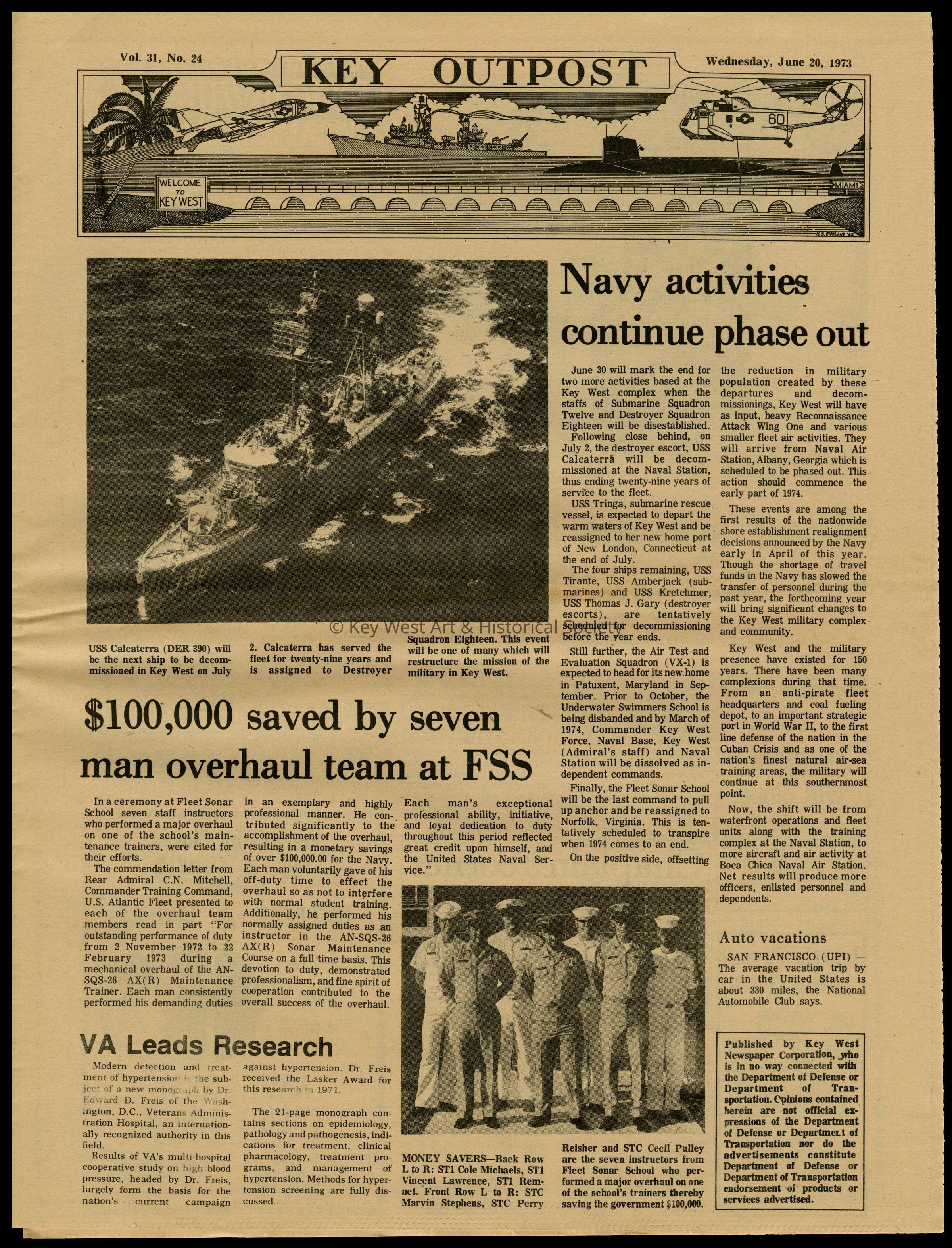 The June 20, 1973 edition of the 'Key Outpost' Newspaper printed by Naval Station Key West as an internal newsletter for military and civilians on base. Volume 31, Number 24. Eight pages.Collection