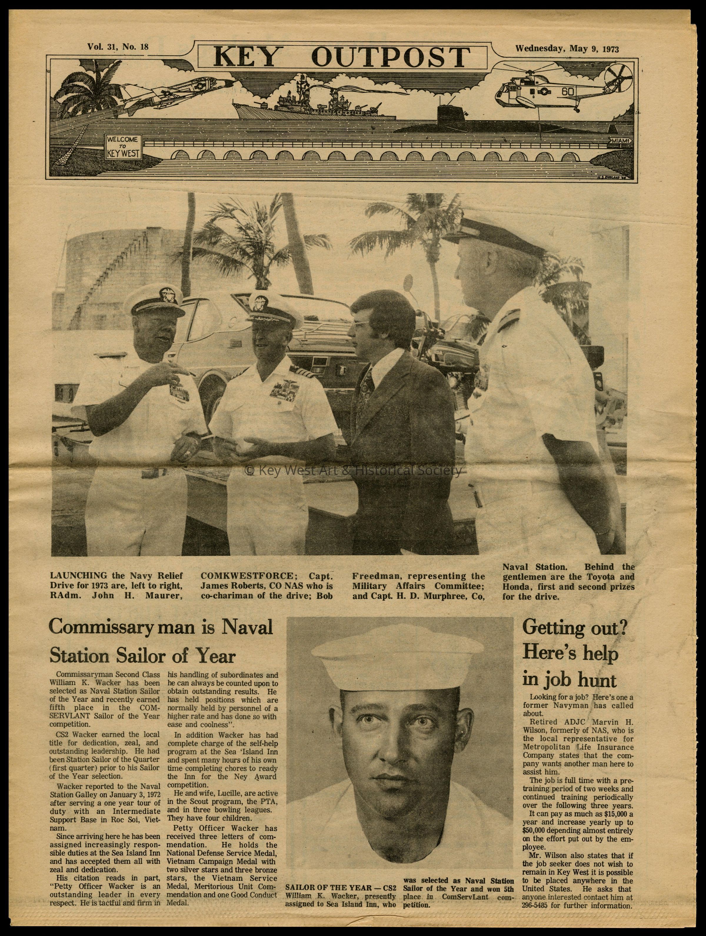 The May 9, 1973 edition of the 'Key Outpost' Newspaper printed by Naval Station Key West as an internal newsletter for military and civilians on base. Volume 31, Number 18. Eight pages.Collection