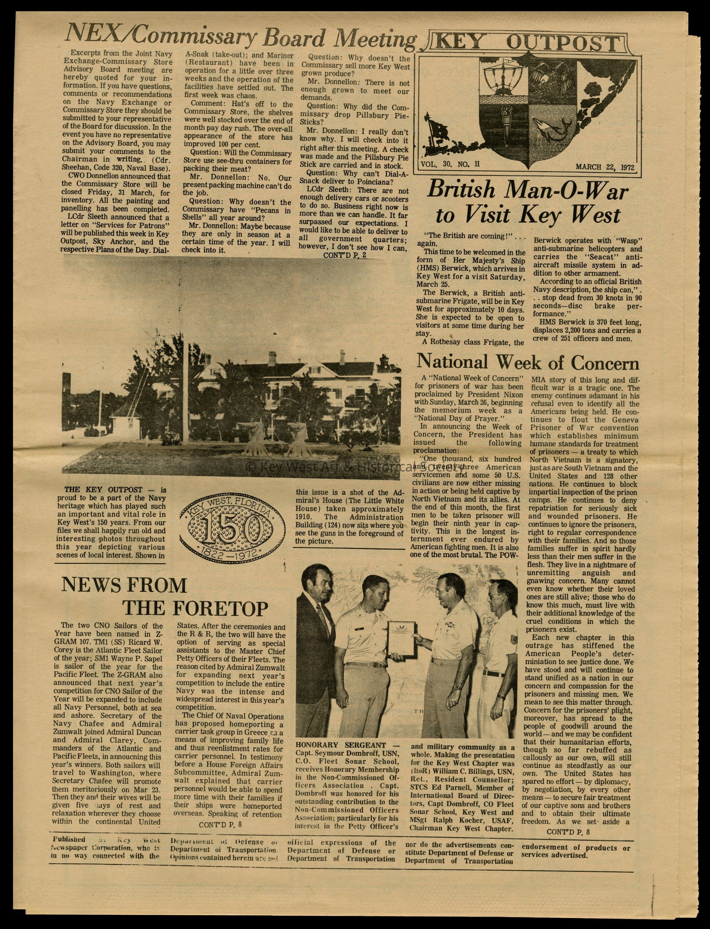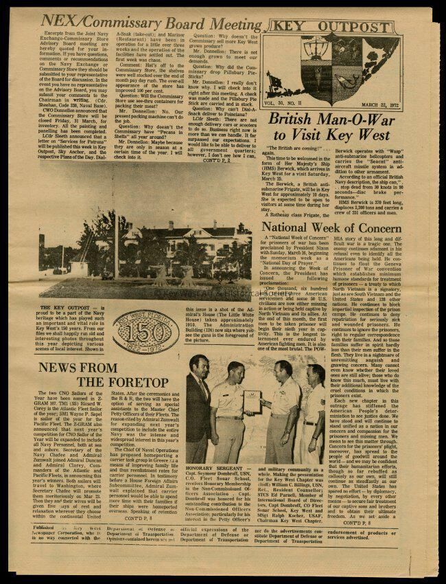 The March 22, 1972 edition of the 'Key Outpost' Newspaper printed by Naval Station Key West as an internal newsletter for military and civilians on base. Volume 31, Number 11. Eight pages.Collection