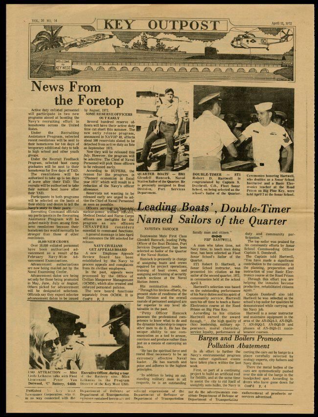 The April 12, 1972 edition of the 'Key Outpost' Newspaper printed by Naval Station Key West as an internal newsletter for military and civilians on base. Volume 31, Number 14. Four pages.Collection