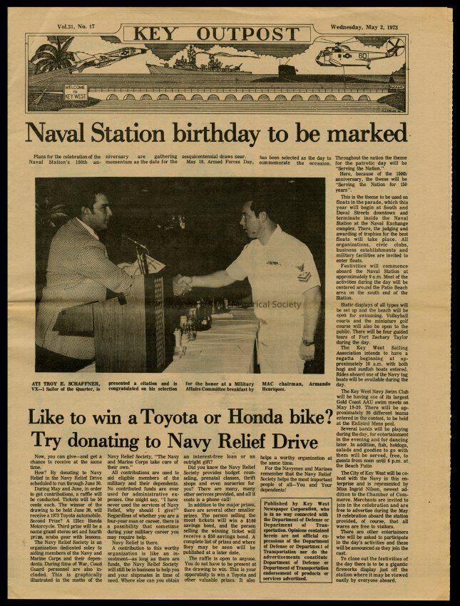 The May 2, 1973 edition of the 'Key Outpost' Newspaper printed by Naval Station Key West as an internal newsletter for military and civilians on base. Volume 31, Number 17. Eight pages.Collection