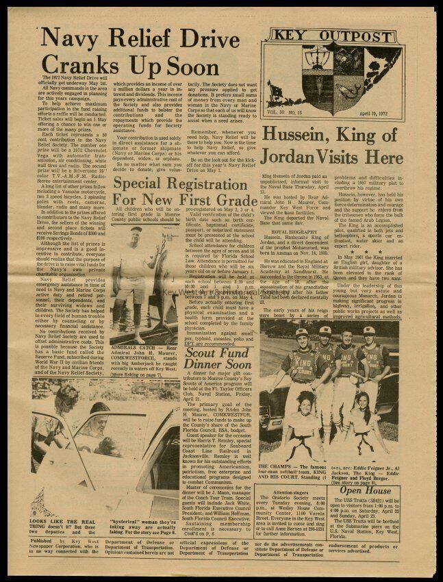 The April 19, 1972 edition of the 'Key Outpost' Newspaper printed by Naval Station Key West as an internal newsletter for military and civilians on base. Volume 31, Number 15. Eight pages.Collection