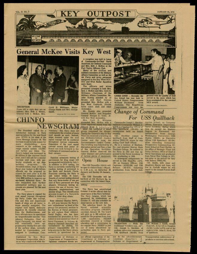 The January 26, 1972 edition of the 'Key Outpost' Newspaper printed by Naval Station Key West as an internal newsletter for military and civilians on base. Volume 31, Number 3. Eight pages.Collection