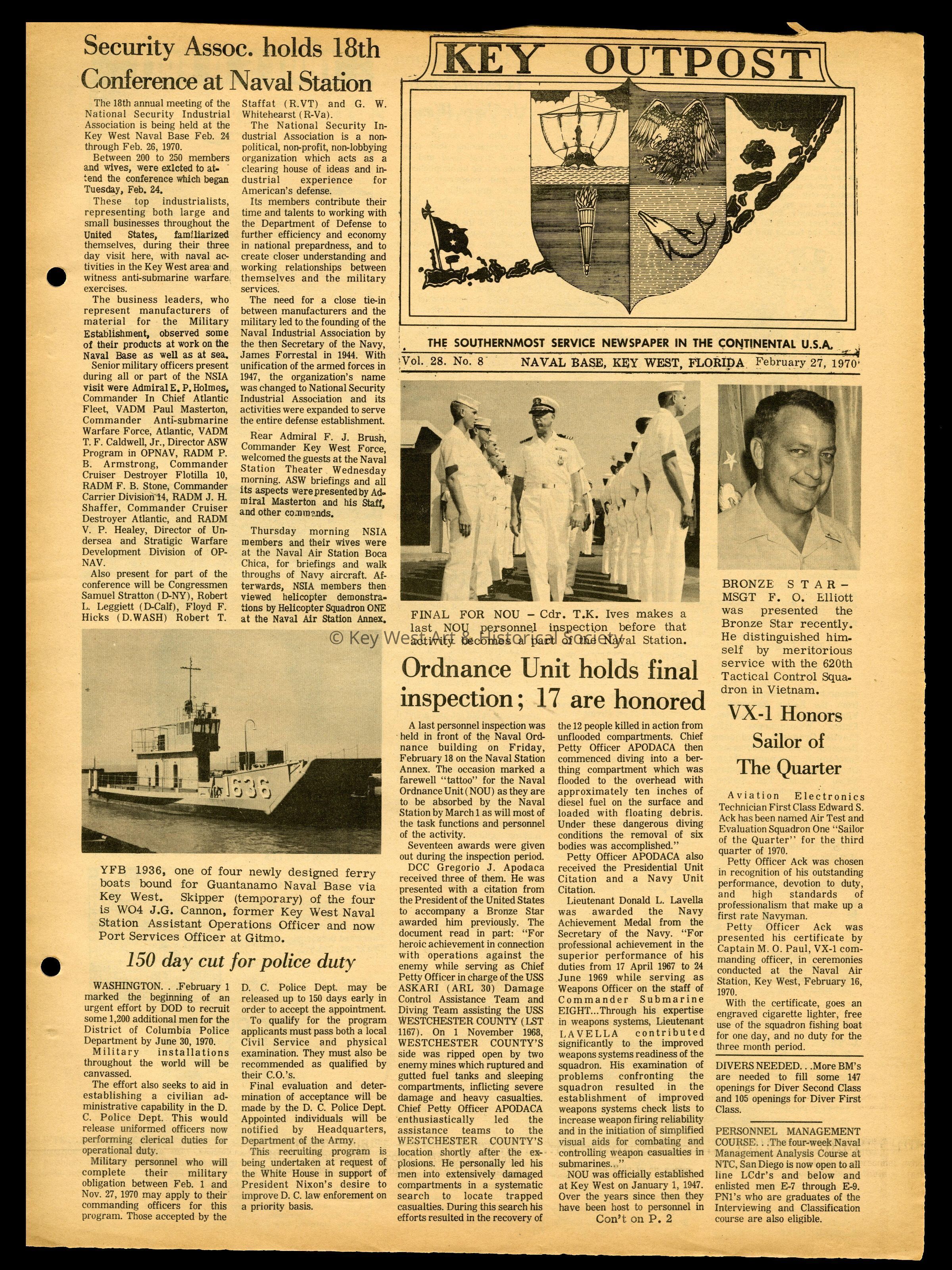 The February 27, 1970 edition of the 'Key Outpost' Newspaper printed by Naval Station Key West as an internal newsletter for military and civilians on base. Volume 28, Number 8. Four pages.Collection
