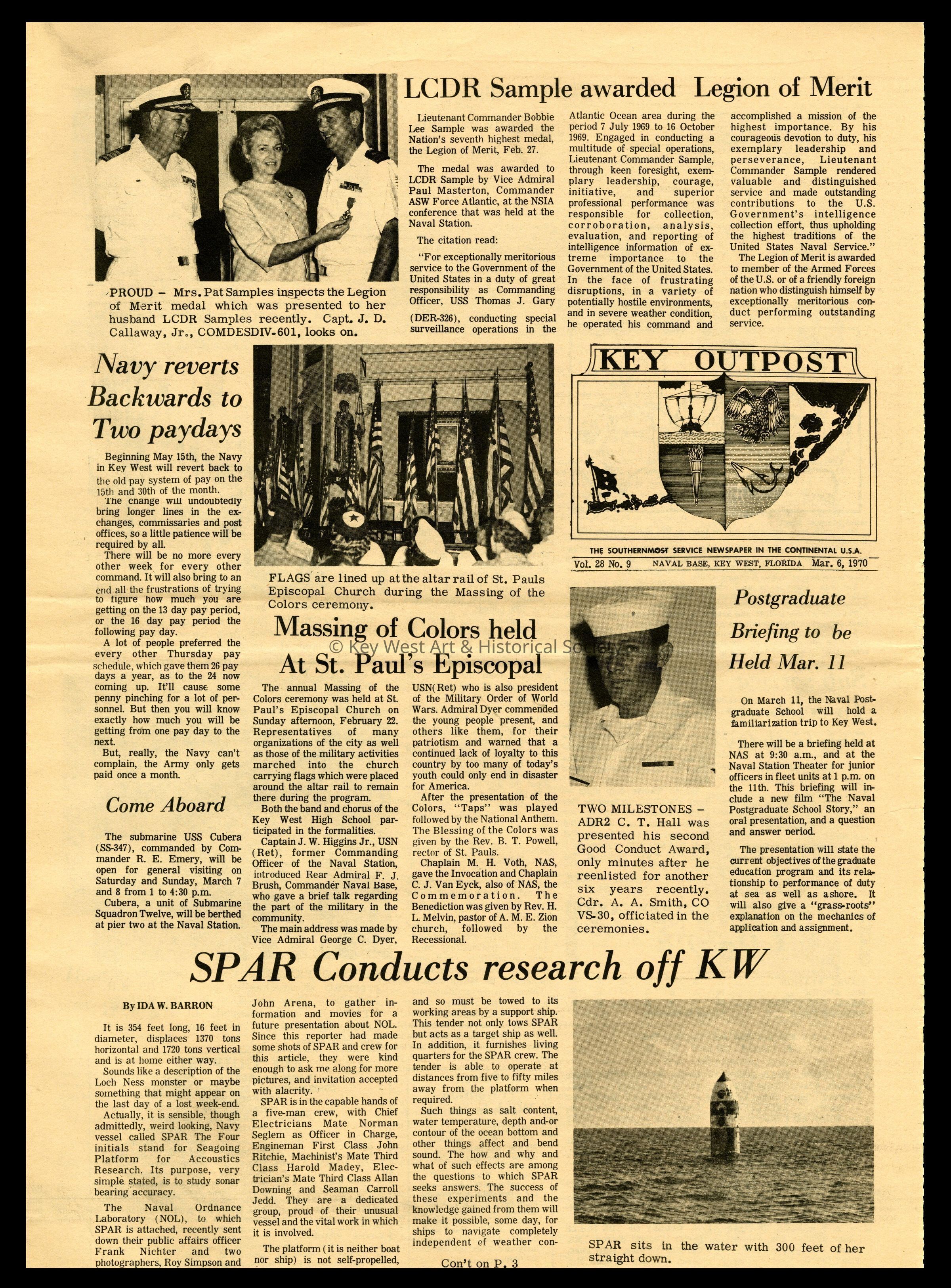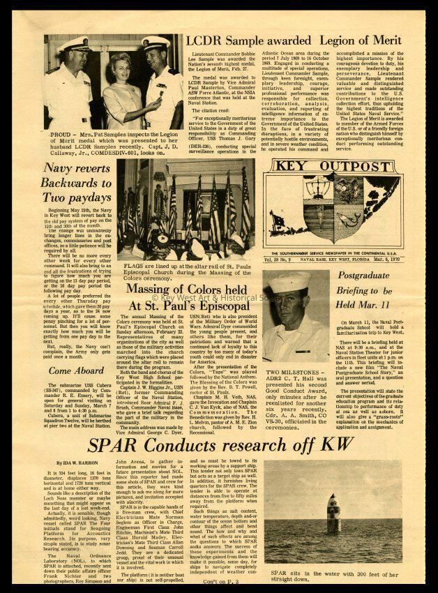 The March 6, 1970 edition of the 'Key Outpost' Newspaper printed by Naval Station Key West as an internal newsletter for military and civilians on base. Volume 28, Number 9. Four pages.Collection