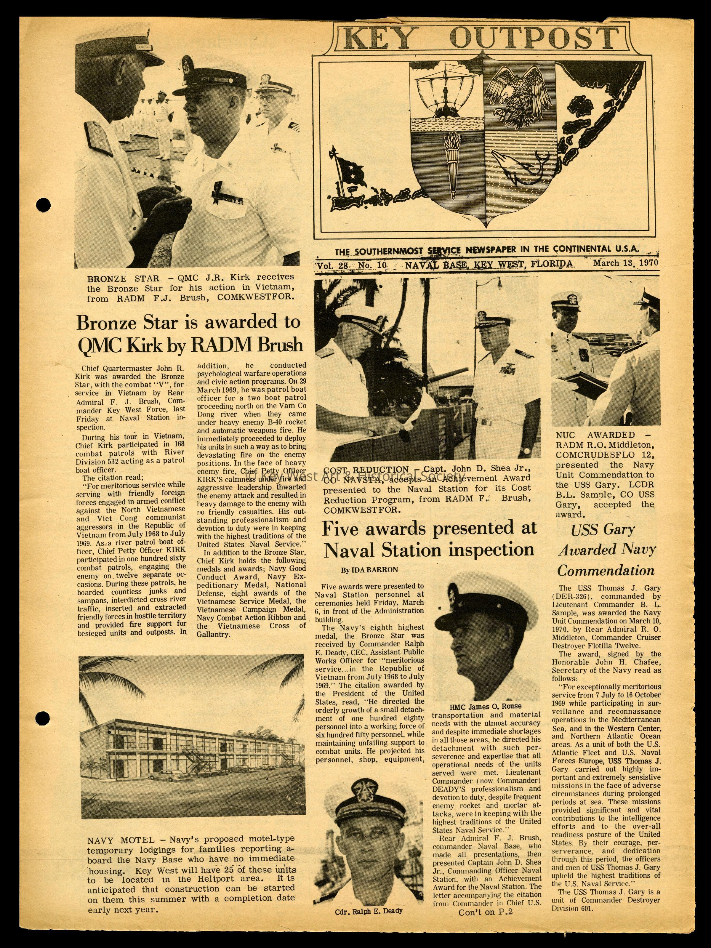 The March 13, 1970 edition of the 'Key Outpost' Newspaper printed by Naval Station Key West as an internal newsletter for military and civilians on base. Volume 28, Number 10. Four pages.Collection