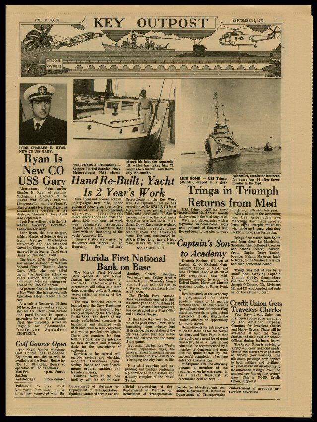 The September 7, 1972 edition of the 'Key Outpost' Newspaper printed by Naval Station Key West as an internal newsletter for military and civilians on base. Volume 31, Number 34. Eight pages.Collection