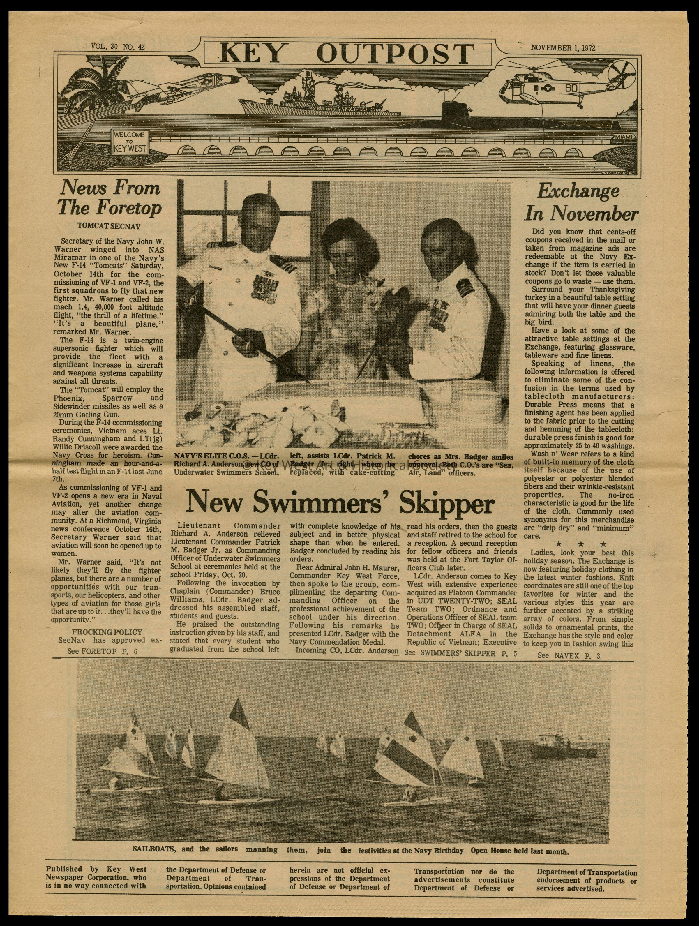 The November 1, 1972 edition of the 'Key Outpost' Newspaper printed by Naval Station Key West as an internal newsletter for military and civilians on base. Volume 30, Number 42. Eight pages.Collection