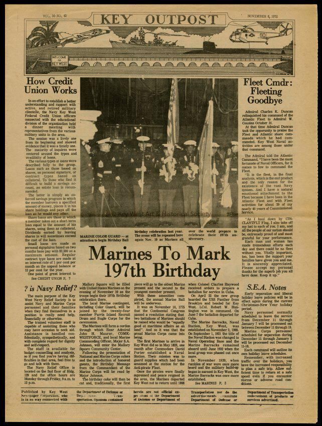 The November 8, 1972 edition of the 'Key Outpost' Newspaper printed by Naval Station Key West as an internal newsletter for military and civilians on base. Volume 30, Number 43. Eight pages.Collection