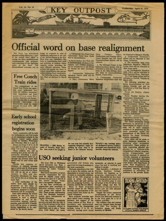 The April 25, 1973 edition of the 'Key Outpost' Newspaper printed by Naval Station Key West as an internal newsletter for military and civilians on base. Volume 31, Number 16. Eight pages.Collection