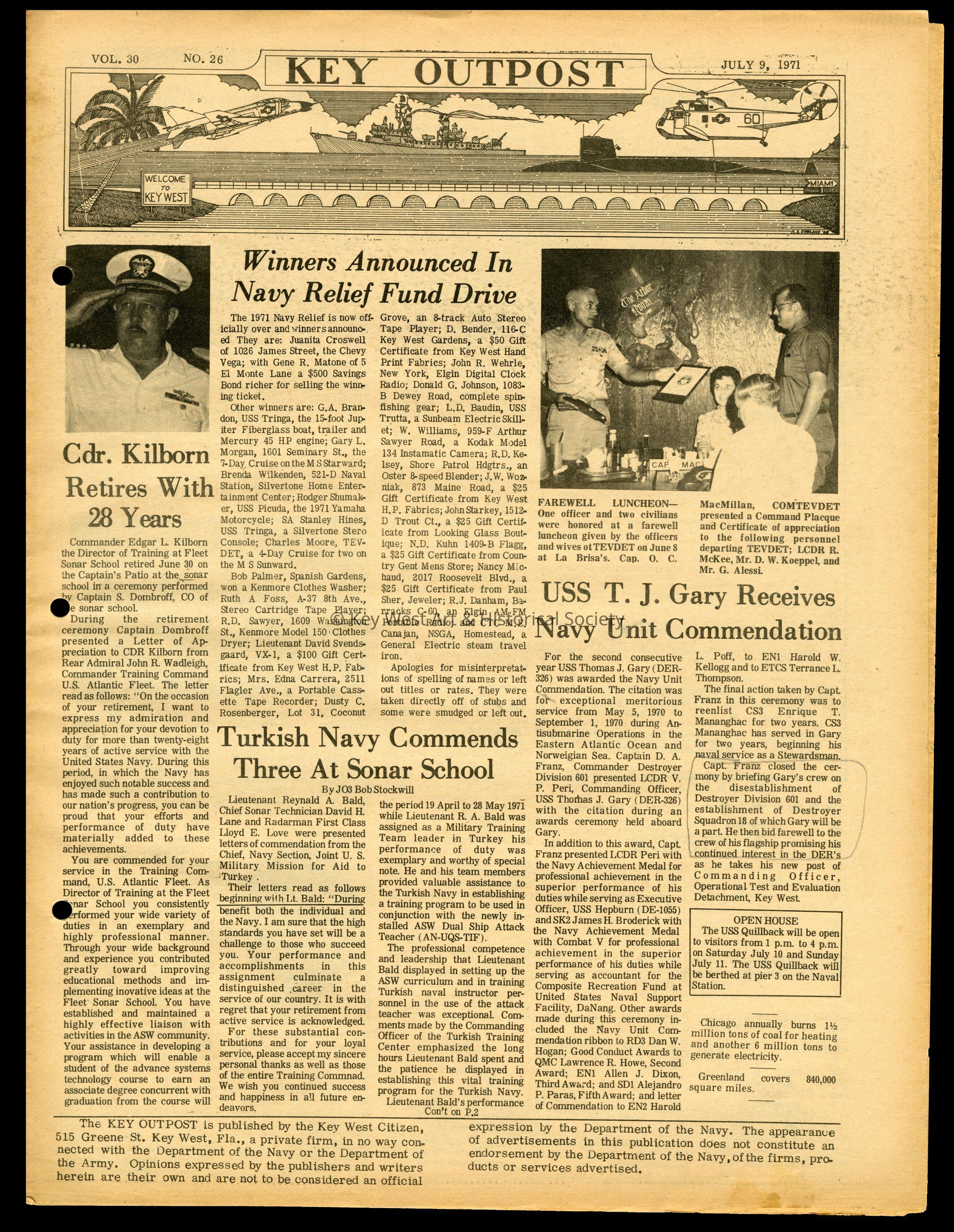The July 9, 1971 edition of the 'Key Outpost' Newspaper printed by Naval Station Key West as an internal newsletter for military and civilians on base. Volume 30, Number 26. Eight pages.Collection