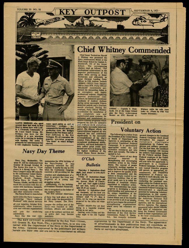 The September 9, 1971 edition of the 'Key Outpost' Newspaper printed by Naval Station Key West as an internal newsletter for military and civilians on base. Volume 30, Number 35. Eight pages.Collection