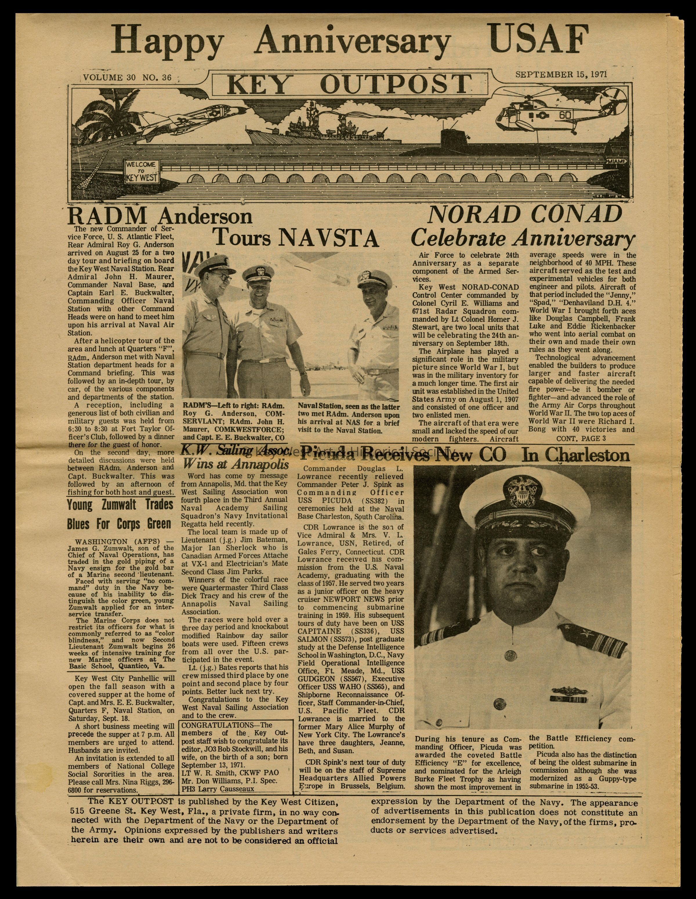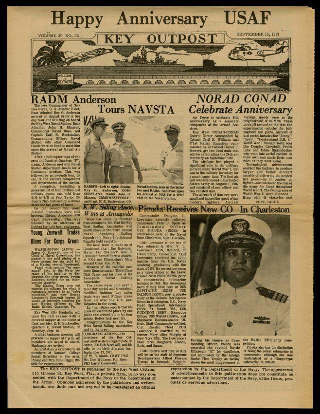 The September 15, 1971 edition of the 'Key Outpost' Newspaper printed by Naval Station Key West as an internal newsletter for military and civilians on base. Volume 30, Number 36. Eight pages.Collection