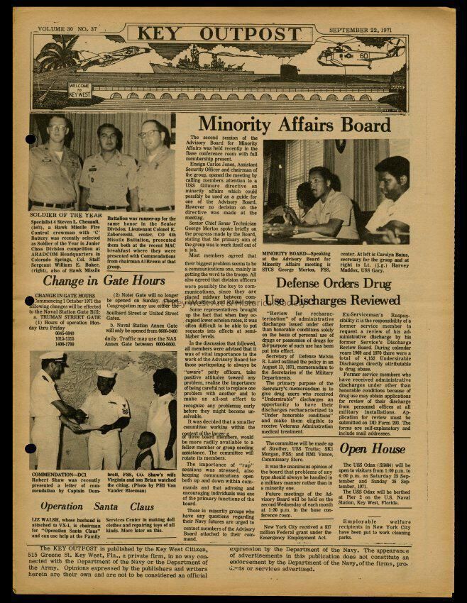 The September 22, 1971 edition of the 'Key Outpost' Newspaper printed by Naval Station Key West as an internal newsletter for military and civilians on base. Volume 30, Number 37. Four pages.Collection