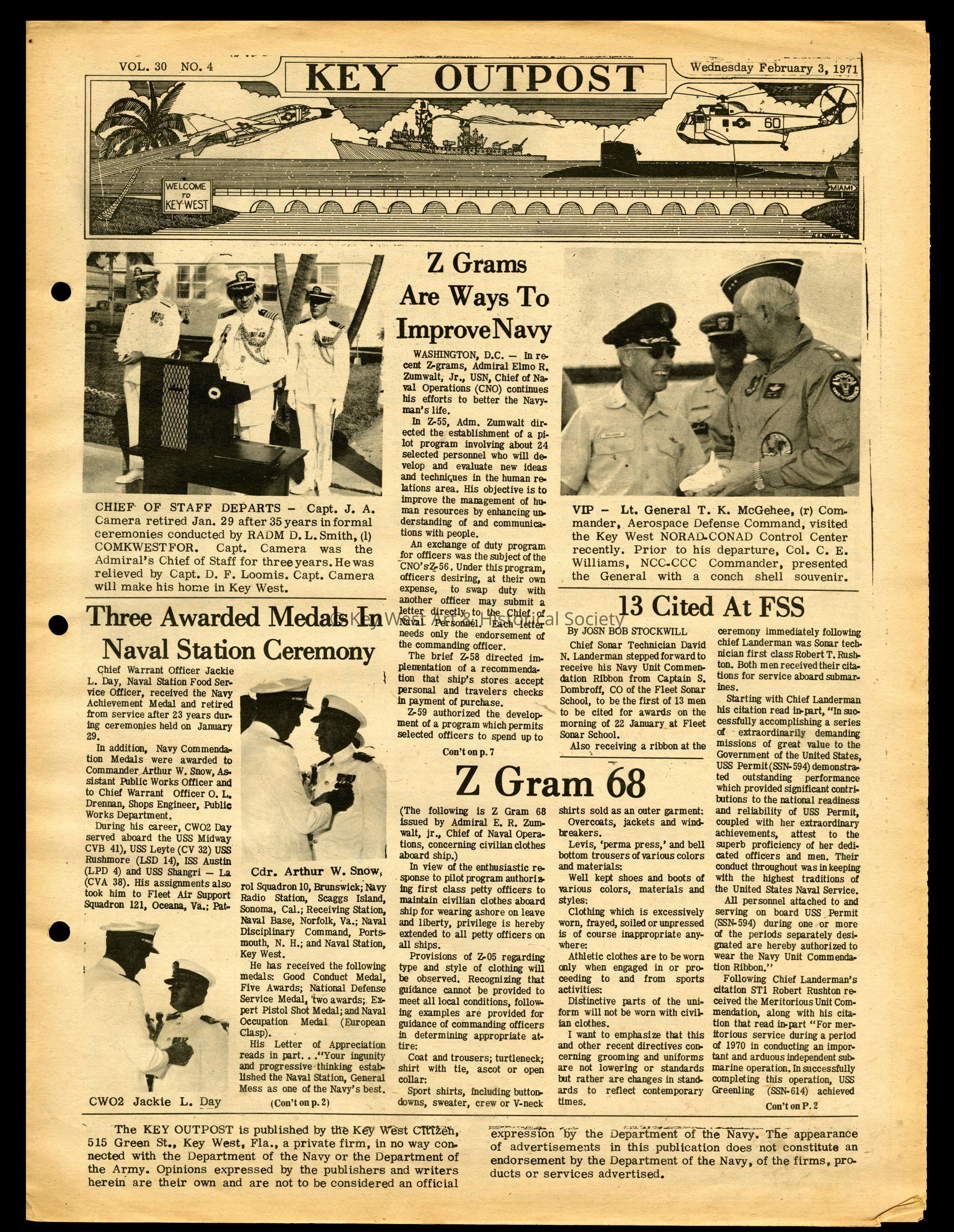 The February 3, 1971 edition of the 'Key Outpost' Newspaper printed by Naval Station Key West as an internal newsletter for military and civilians on base. Volume 30, Number 4. Eight pages.Collection