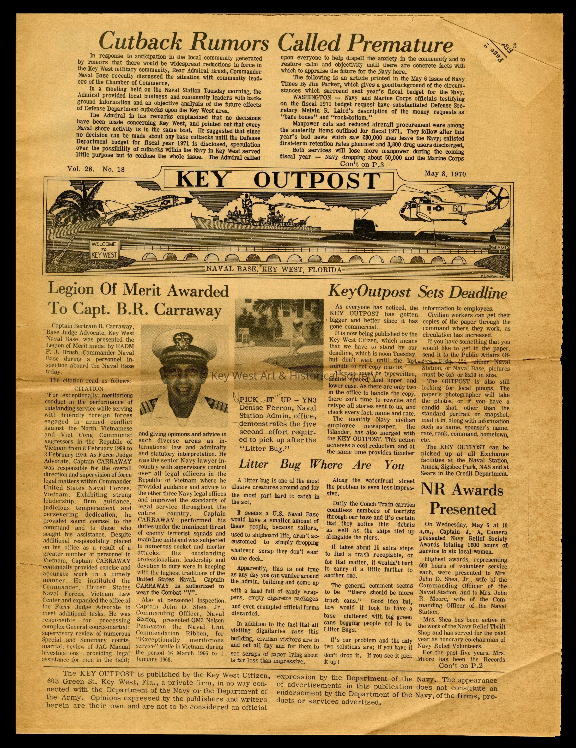The May 8, 1970 edition of the 'Key Outpost' Newspaper printed by Naval Station Key West as an internal newsletter for military and civilians on base. Volume 28, Number 18. Eight pages.Collection