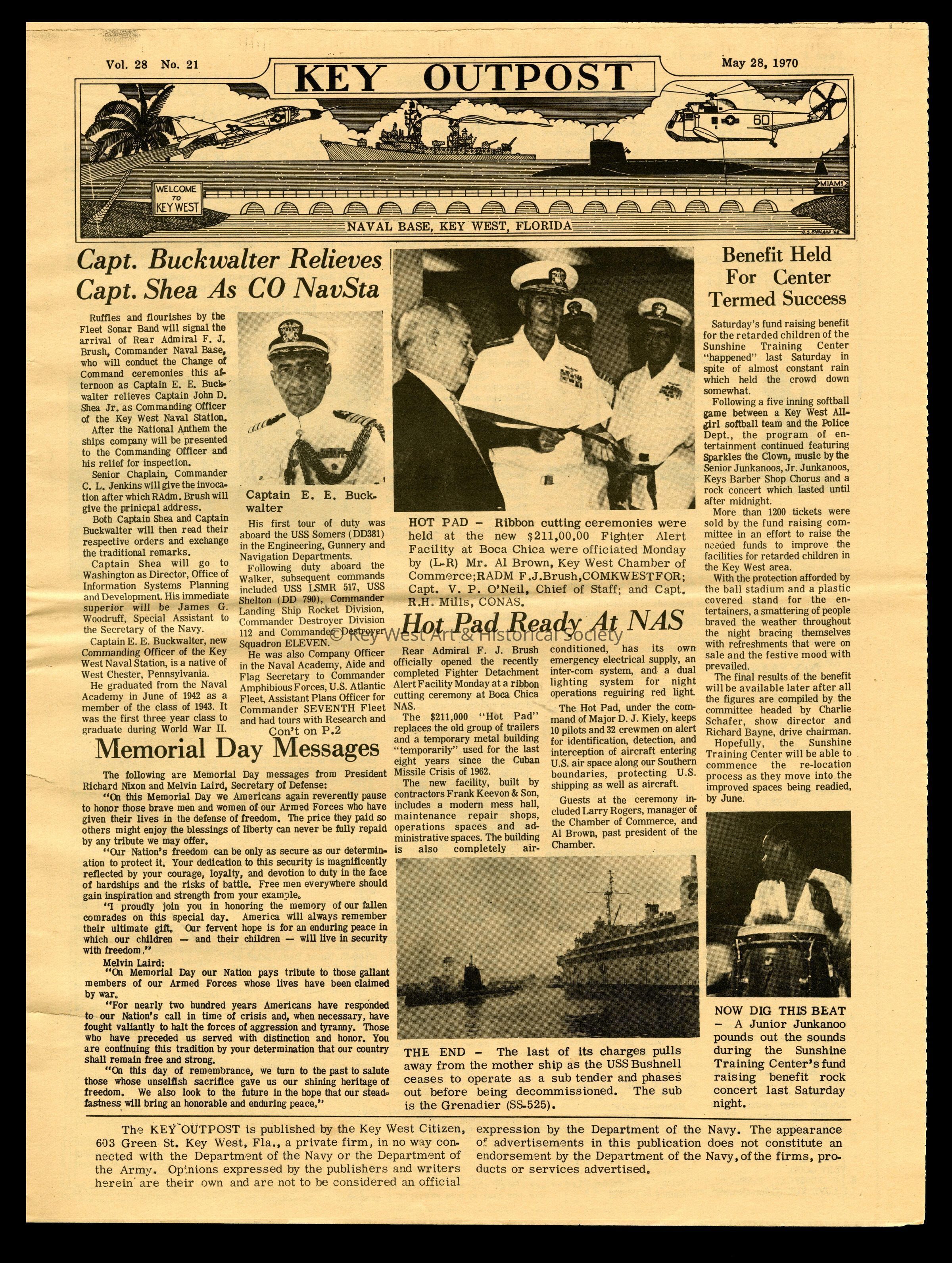 The May 28, 1970 edition of the 'Key Outpost' Newspaper printed by Naval Station Key West as an internal newsletter for military and civilians on base. Volume 28, Number 21. Eight pages.Collection