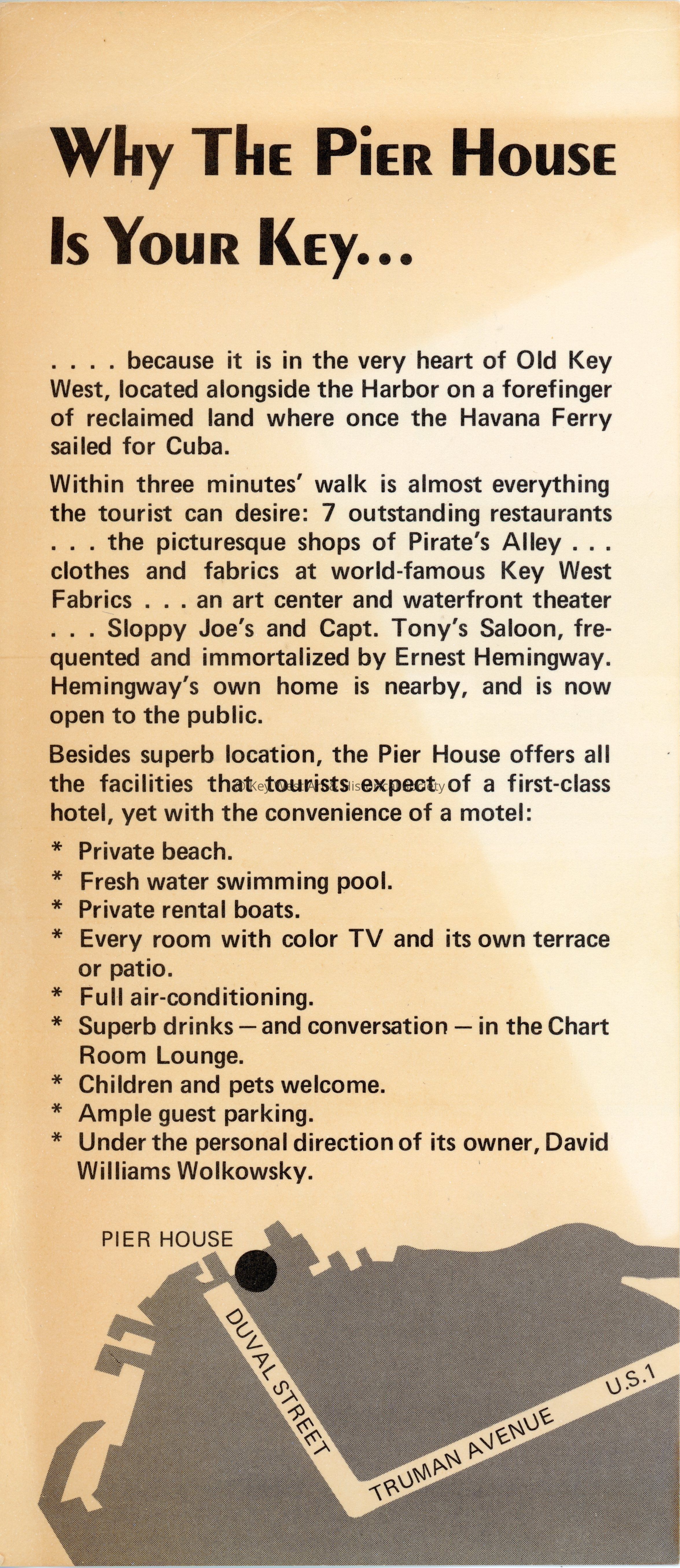 A green and white rack card for the Pier House opened by David Wolkowsky in 1967 at 5 Duval Street. Now Pier House Resort & Spa, the expanded resort occupies 1 Duval Street.Collection