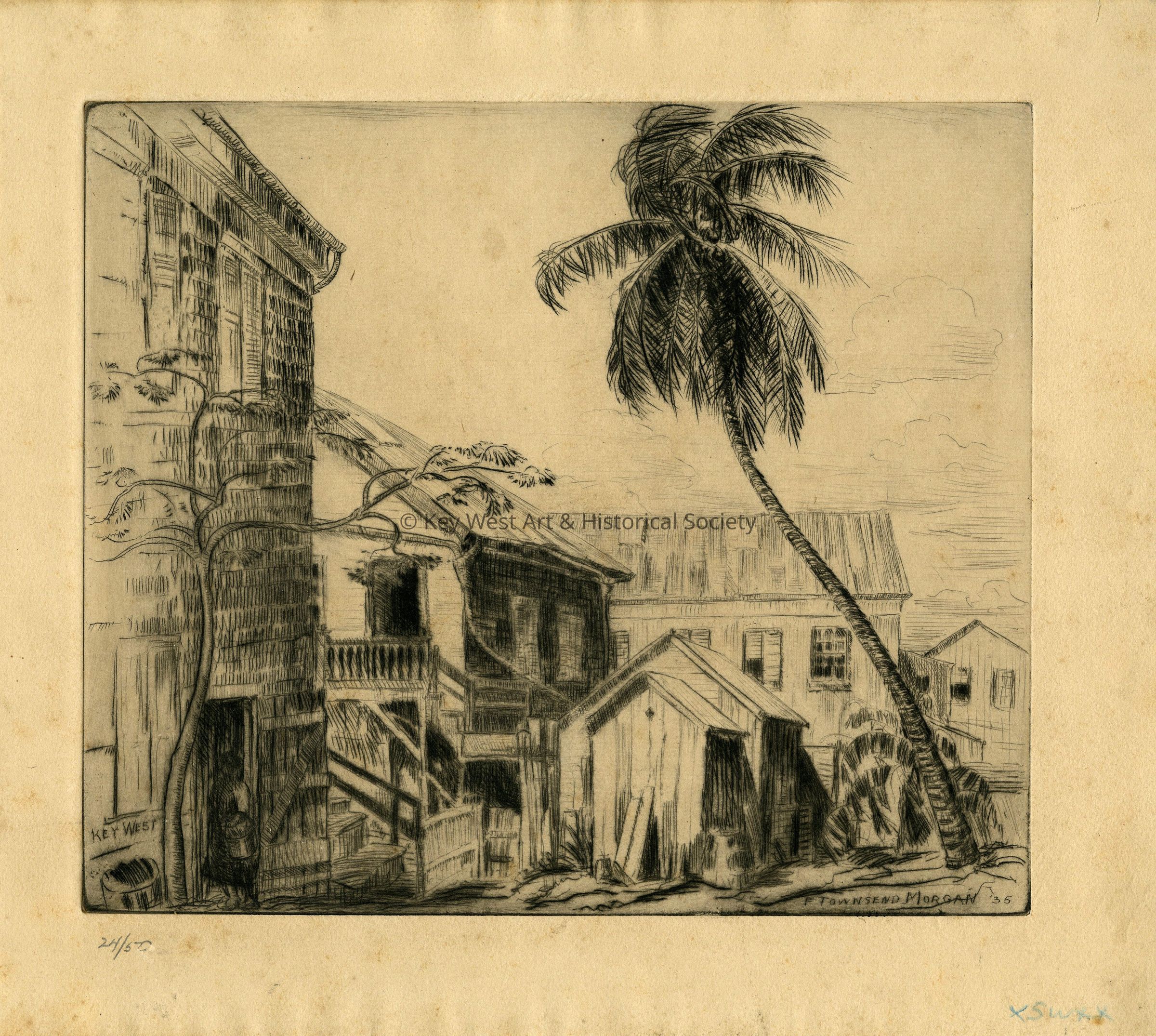 Etching by F. Townsend Morgan of an unknown Key West street and buildings, shaded by a palm tree. Number 24/50.